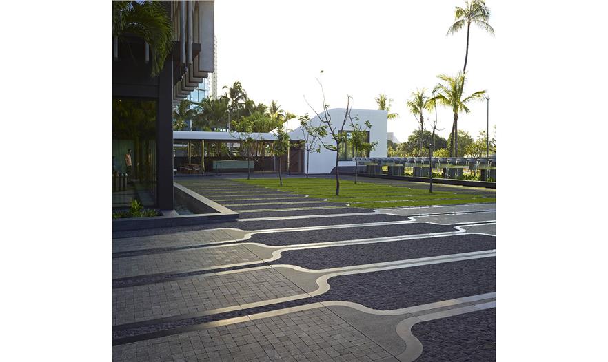 IBM Victoria Ward塔樓的這個新庭院受現(xiàn)有現(xiàn)代化立面的啟發(fā)建造的,用景觀展示出現(xiàn)代化夏威夷建筑特色和文化歷史。IBM塔樓是由夏威夷現(xiàn)代主義藝術家Vladimir Ossipoff設計。這個新景觀是夏威夷景觀特色的精華展現(xiàn),是火奴魯魯中央24公頃(60英畝)區(qū)域多功能主體規(guī)劃項目的一部分。