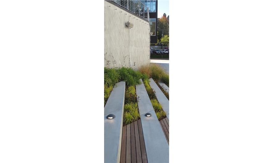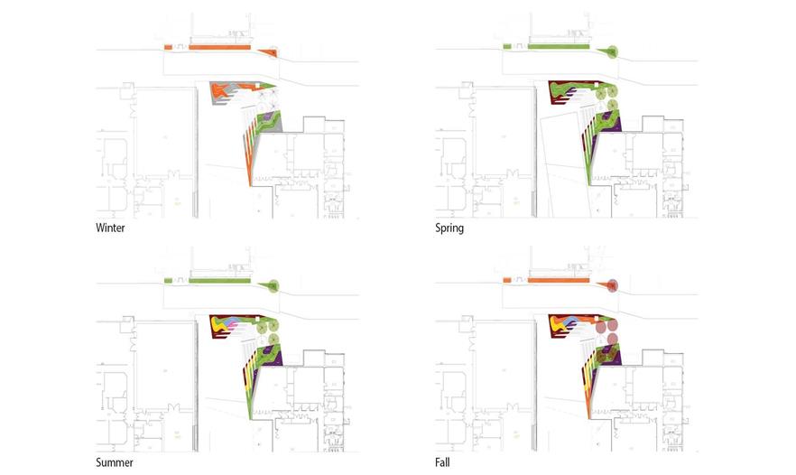 選擇的植物種類與密蘇里植物園相稱,并與客戶進行了協(xié)調(diào)。植物的位置利用坡度變化建造出了分層效果,同時也為小徑提供了緩沖帶。謝爾頓音樂廳底部的樹林和草地種植幫助連接小徑兩邊的空間。植物種類依據(jù)季節(jié)特性來選擇,配合networks建筑不斷變化的新聞和媒體周期。