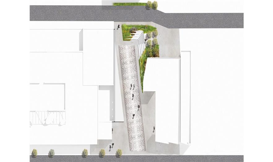 不同灰色系的地磚根據(jù)廣場上的聲波建造。有圖案的鋪裝地面設(shè)有安裝臨時帳篷結(jié)構(gòu)的錨點,使該空間在任何天氣情況下都生氣盎然。廣場的鋪裝路面是明亮的顏色,以此來增強該區(qū)域的反射率,當對比現(xiàn)有的停車場時顯得最突出。