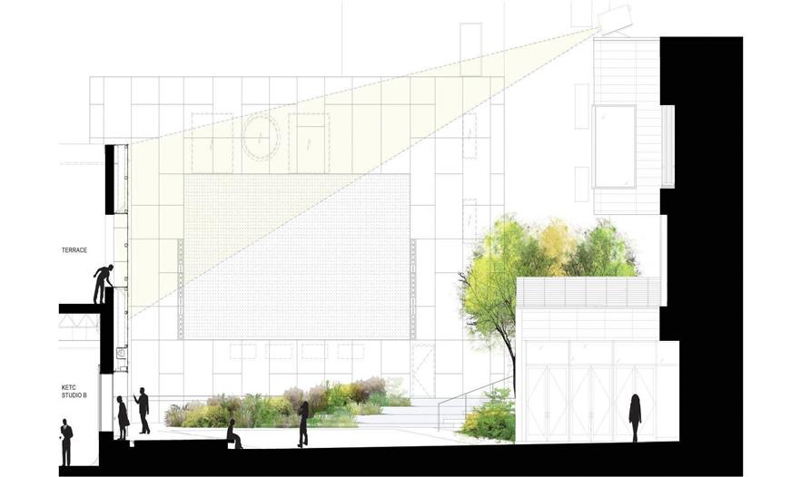 公共媒體空間的設(shè)計建造了一個集藝術(shù)、教育和公共媒體為一體的互動性開放空間。該空間有為小群體設(shè)置的表演舞臺、多個座位區(qū)、一個大型的投影屏以及漂亮的植物配置,遵循密蘇里本土的草原景觀。這表達出公共媒體與公共空間未來的關(guān)系。
