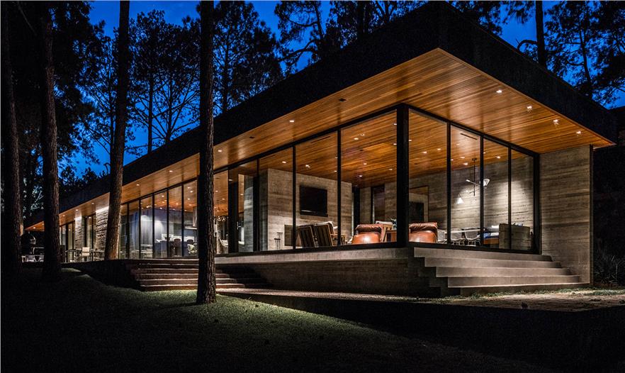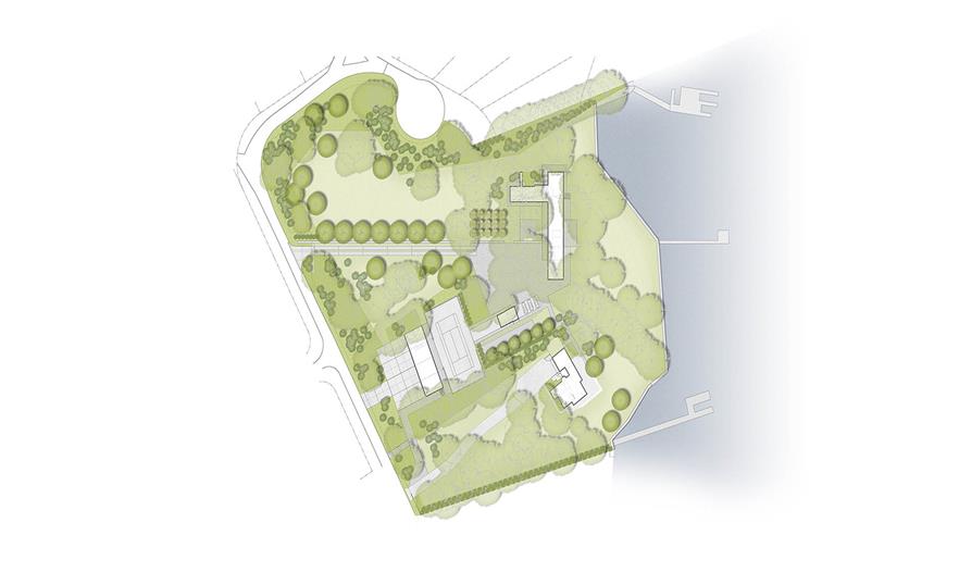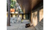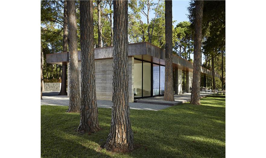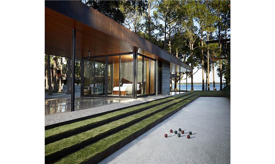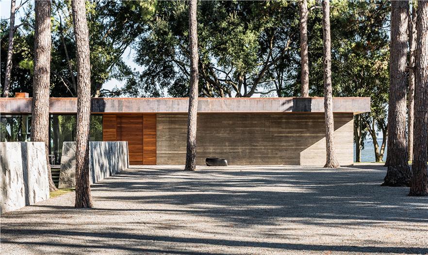 這一系列的建筑位于雪松溪湖上一個林木繁茂的2.8公頃(7英畝)的區(qū)域上,在林木線下交錯建造,可以觀賞到周圍湖泊優(yōu)美的景色。設(shè)計(jì)團(tuán)隊(duì)與客戶合作將長久以來的家庭住宅改造成一個遺址性的周末度假村,建筑結(jié)構(gòu)與該區(qū)域完美結(jié)合,就好像扎根許多年了。主體規(guī)劃方案把該項(xiàng)目設(shè)置在湖上,幫助設(shè)計(jì)師在松樹和槲樹的樹冠下設(shè)置房屋、涼亭、網(wǎng)球場和大型車庫。主住宅區(qū)插入到現(xiàn)有的一片高大的松樹和橡樹中,最小化樹木損失、最大化遠(yuǎn)處的湖景。該區(qū)域上的松樹不僅大,還是客戶年輕時候種植的。整個項(xiàng)目使用的是簡單、易得的材料,如木頭、石頭、混凝土和風(fēng)化鋼,反映本土環(huán)境。
