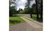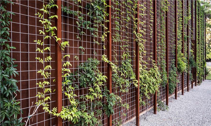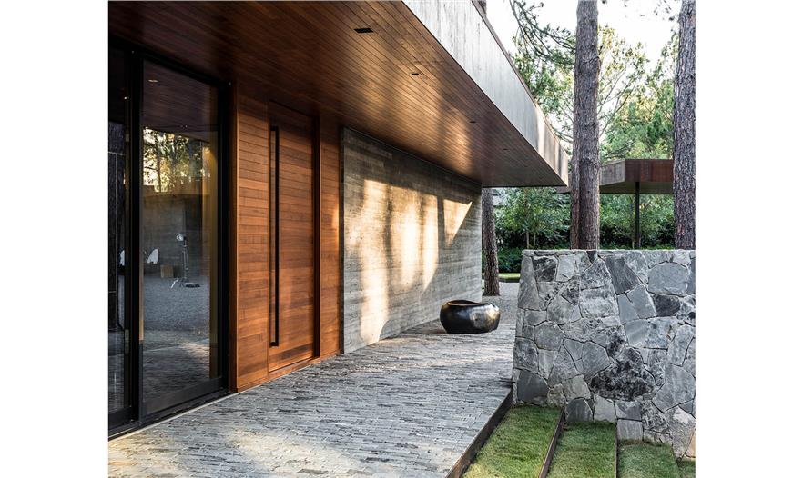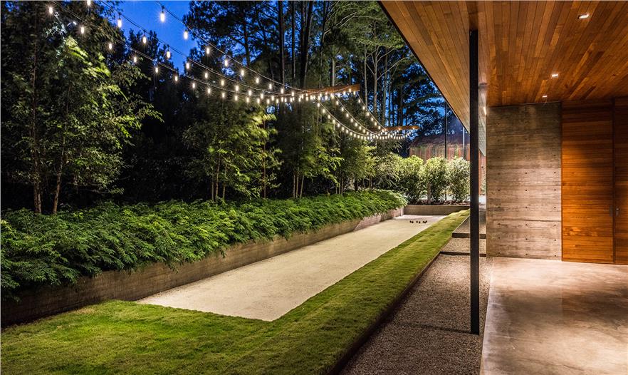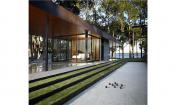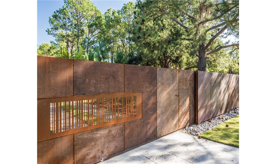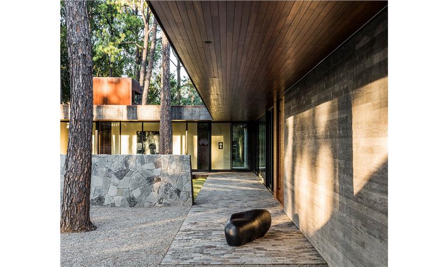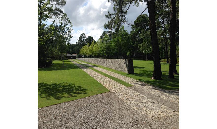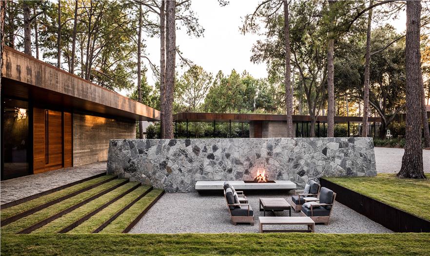 人們順著鄉(xiāng)村道從一個風(fēng)化鋼板門和屏幕中進(jìn)入。大門上切割出“條形碼”的水柱表明這里之前是個家庭住宅。大門打開后就會看到一個107米(350英尺)長的石塊墻,直達(dá)遠(yuǎn)處的住宅區(qū)。這個石頭墻沿著鵝卵石車道到達(dá)停車場,看起來會隨著車輛的高度而增高一樣。該道沿線墻壁上的策略性開口好讓成熟的現(xiàn)存樹木插入到垂直面中,并凸顯出遠(yuǎn)處的房屋和景觀。墻壁對面,榆樹的種植增強(qiáng)了入口處的線性特征,為遠(yuǎn)處區(qū)域的開闊性提供緩沖帶。