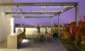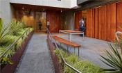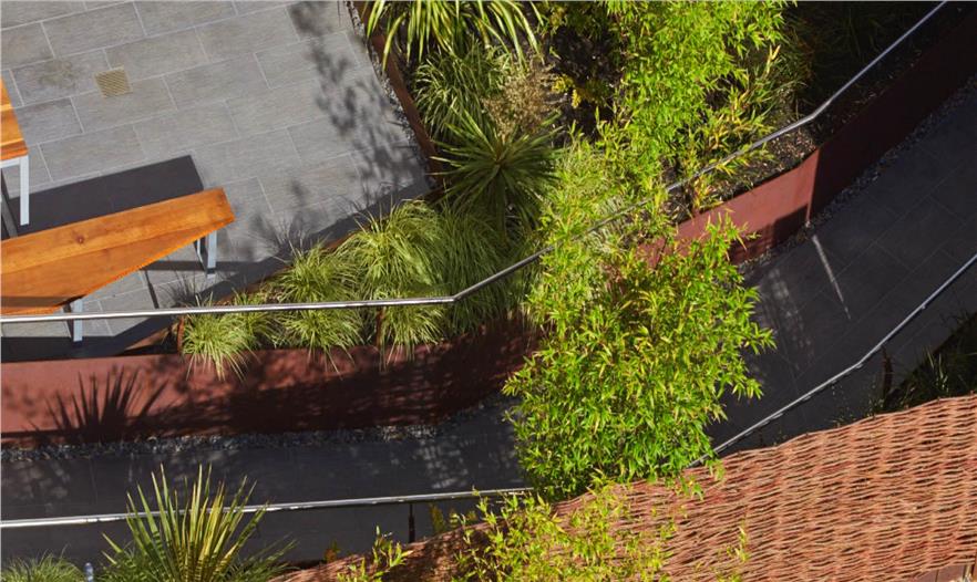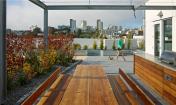 屋頂被設(shè)計(jì)成公共空間,允許居民進(jìn)入。陽光和煦的庭院中心種有澳大利亞的山龍眼和袋鼠爪植物,提供植物棲息地和陽光庭院的背景。屋頂庭院還有共享的便利設(shè)施,用于戶外用餐,如特制的廚房和社區(qū)桌以及各種各樣的宿根植物。戶外用餐空間在花架下面,上面掛有LED燈,晚上用餐時(shí),就能觀賞到“墜落的星星”。該空間的中心是一個(gè)社區(qū)桌,用于群體用餐,是教堂式的長椅以及由回收的紅木建造的原木桌。庭院周邊和用餐區(qū)附近區(qū)域的藥草園也用于做菜,增強(qiáng)了戶外用餐體驗(yàn)。這個(gè)項(xiàng)目的所有方面都允許增加用于公眾和建筑租戶的空間。每個(gè)特征都是精心設(shè)計(jì)的,最大化每個(gè)小空間的體驗(yàn)。