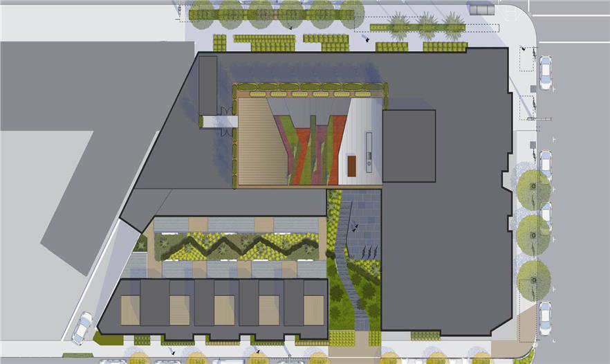該項(xiàng)目的街景是可持續(xù)性和社會(huì)性規(guī)劃,雨水經(jīng)由街道沿線的植物得到處理。Ivy街沿線實(shí)施了減速策略,設(shè)置新的街道突起和流量表,而且Ivy街沿線的街道綠化還設(shè)有減速彎道,用來種植街道樹木和實(shí)施減速策略。街道景觀活躍了該建筑路面上的商業(yè)氛圍?;ㄅ韬蜆淇咏缍魍臻g和戶外用餐空間。Ivy和Gough街角的新突起由特制的鋼鐵系繩柱框架。這個(gè)新突起構(gòu)成了商業(yè)街角沿線的一個(gè)固定的小公園。