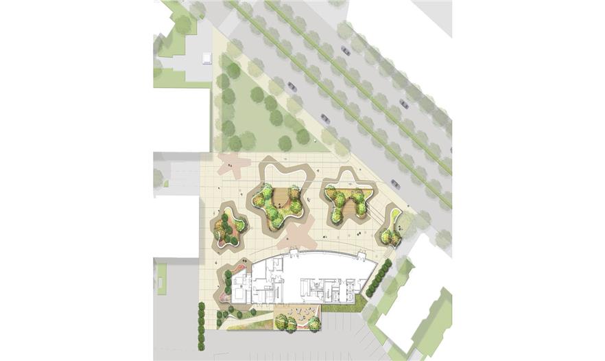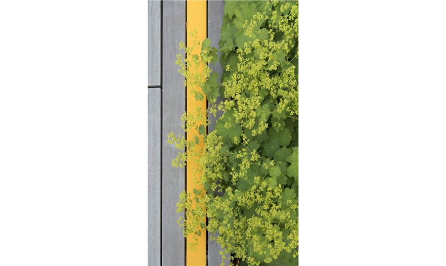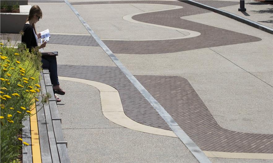 南查爾斯減流污水渠的多個分支到達下面的學(xué)生公寓位置,所以我們不得不設(shè)計和建造該區(qū)域來適應(yīng)困難的回轉(zhuǎn)半徑和Vactor 2100 服務(wù)車的幾何結(jié)構(gòu)。這樣只留下可選擇的植物區(qū)及寬闊的鋪裝路面區(qū)域。我們利用硬景觀解決了這一問題,通過設(shè)計一種鋪裝圖案來遮蔽花盆形式。這樣在地面上建造出一種畫布形式,450名藝術(shù)學(xué)生能從宿舍樓上感受到它。此外,滲透性鋪路材料的這些陰影扮演著雙重角色,作為花盆周圍的圖案式的齒紋震動帶,制止玩滑板。這個圖案橫穿到鄰近的私人道路上,把走廊轉(zhuǎn)變成生活化道路。