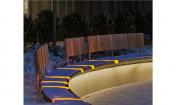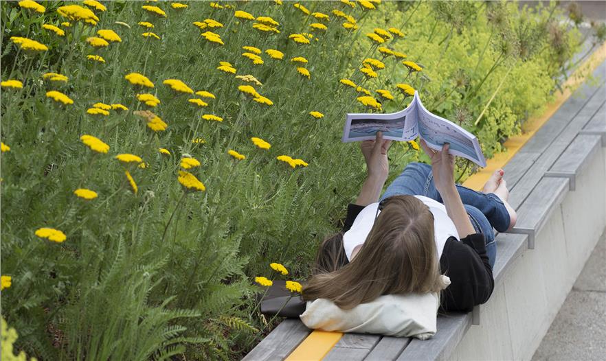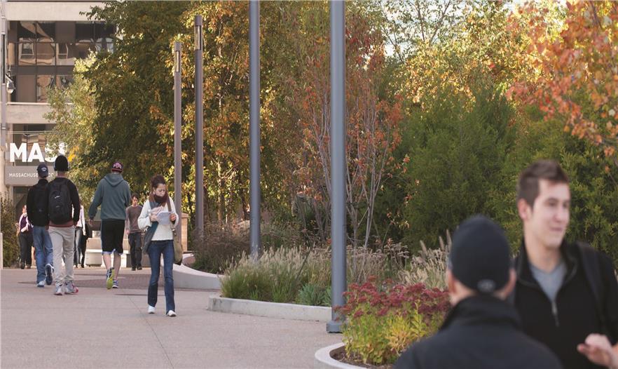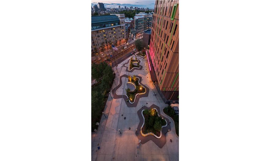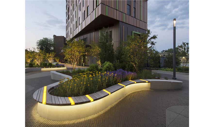 對于這個新學(xué)生宿舍,馬薩諸塞州藝術(shù)與設(shè)計學(xué)院利用景觀設(shè)計重塑其公眾認同,構(gòu)建新的學(xué)生生活中心,反映該學(xué)校的創(chuàng)意性設(shè)計。該景觀關(guān)注該學(xué)校作為該國家唯一一個公共藝術(shù)學(xué)校的地位,頗具實驗性但很隨意,讓學(xué)生感到舒適、自然。該景觀位于波士頓的藝術(shù)大道上,映襯街道的公共生活。該設(shè)計的指導(dǎo)原則是提供座位區(qū),但因藝術(shù)學(xué)校的背景,座椅式矮墻極具藝術(shù)感。座位蜿蜒曲折、波動起伏,分割區(qū)域,供個人、小群體、班級聚會使用。該區(qū)域的鋪裝圖案不管是從地面上還是學(xué)生住宅上看,其形狀都與附近花盆和木制長凳上五彩的燈條相呼應(yīng)。