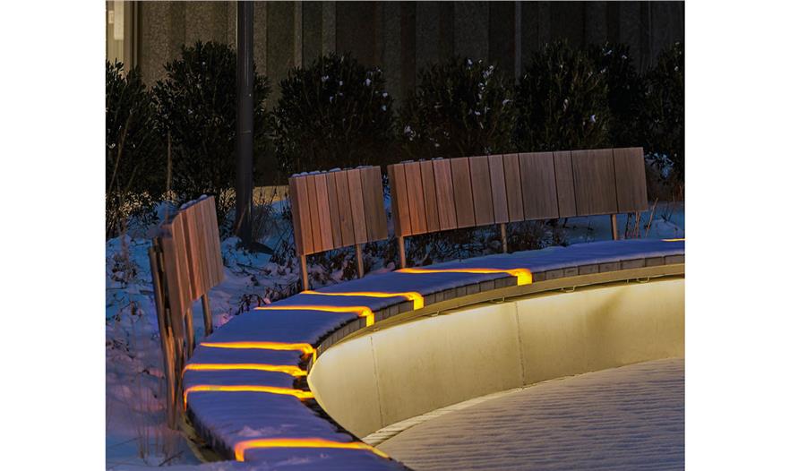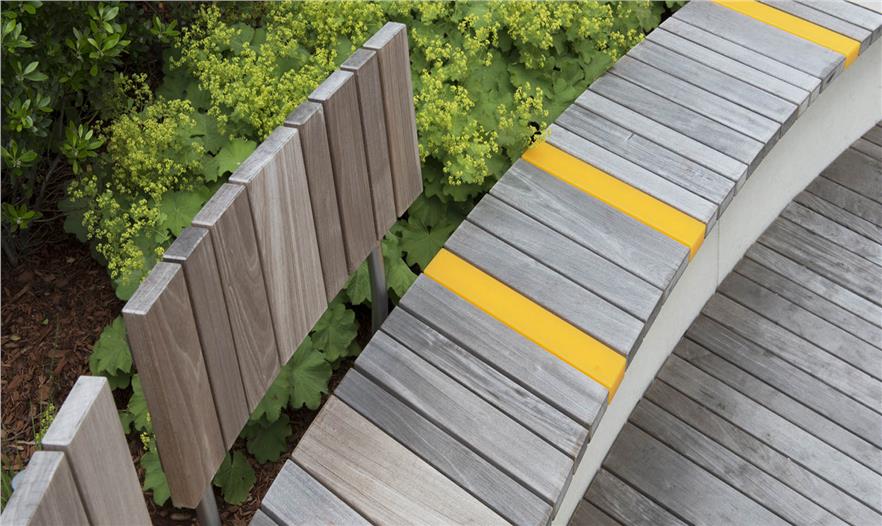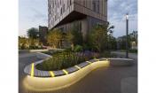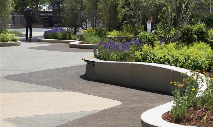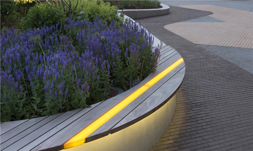 這個項目的材料是持久耐用且典型,但是材料的細節(jié)設(shè)計并不典型。背景鋪裝材料是混凝土,混合五彩的露石。動態(tài)的鋪裝圖案是由線性預(yù)制鋪裝材料和木板路樣式的磚塊構(gòu)成,突出建筑入口和花盆結(jié)構(gòu)。蜿蜒曲折的座椅式矮墻是由特制的預(yù)制混凝土建造,大部分結(jié)構(gòu)設(shè)計獨特。我們與預(yù)制公司交換了3D電子文檔,確保高水平的建筑容差。木頭和燈條隨著寬度變化,但是它們的朝向是一致的。這與座椅式矮墻的曲折和彎道相呼應(yīng)??傊?,良好的設(shè)計和簡單的材料以及一些曲折結(jié)構(gòu)讓該項目從一個小城市區(qū)域轉(zhuǎn)變成空間和視覺體驗。