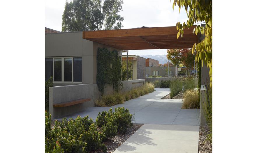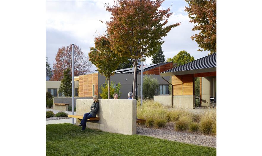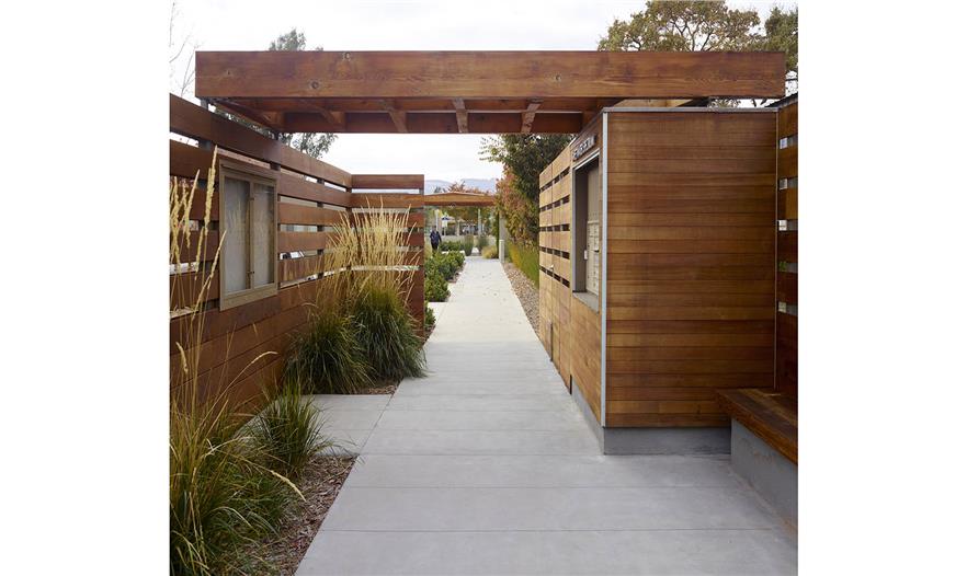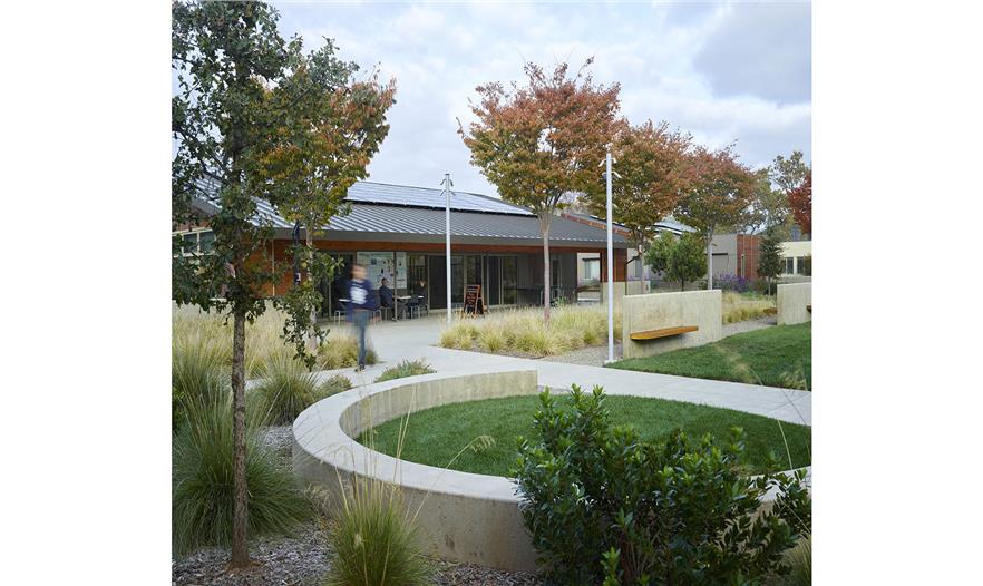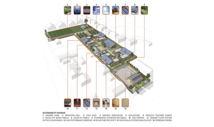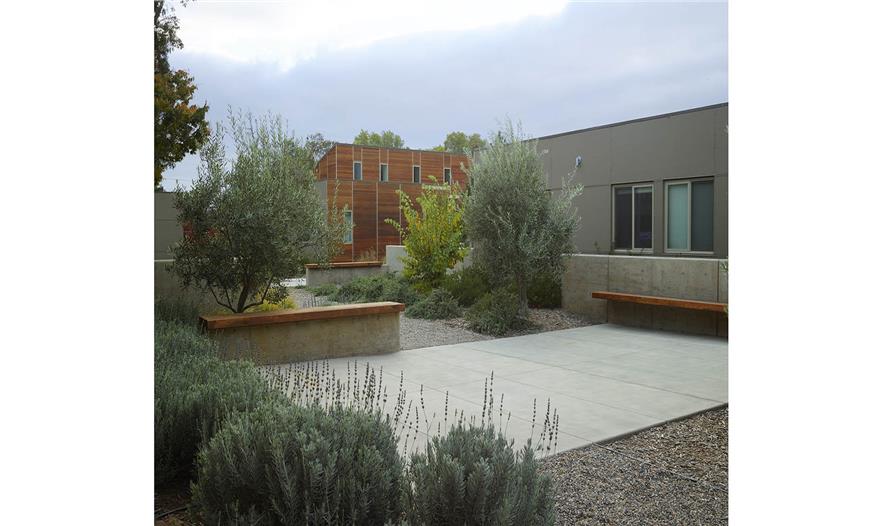 作為可持續(xù)性區(qū)域策略以及該區(qū)域雨水管理的一部分,之前碎石鋪裝的道路用于停車區(qū)和車道,而且該區(qū)域通過生態(tài)草溝將3面結(jié)合起來。人們使用當(dāng)?shù)鼐械乃喂嘀参?,并選擇滿足該城市節(jié)水景觀條例的植物,同時(shí)提供全年效益、陰涼,從建筑環(huán)境中解脫出來,避免惹人厭、有毒的樹葉和水果。植物配置主要是加利福尼亞本土樹木、宿根和裝飾性草本植物,增添了些地中海植物。生態(tài)草溝的特色是濱河植物,解決每年冬季洪水的問題,但是依然會(huì)在加利福尼亞干熱的夏季存活,灌溉需求少。有機(jī)農(nóng)場(chǎng)和果園為居民、員工和游客提供健康的產(chǎn)品和雞蛋。