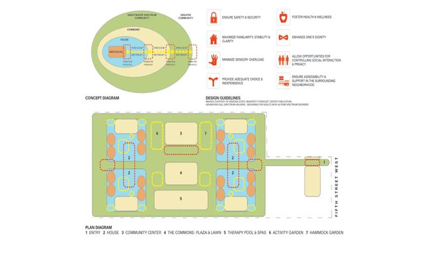 景觀設(shè)計(jì)師與客戶、建筑師、索諾馬市合作,以發(fā)表的研究為基礎(chǔ),如亞利桑那州立大學(xué)斯蒂爾和阿倫茨的“全面推進(jìn)住房建設(shè):為患有自閉癥的成年人設(shè)計(jì)住宅”以及西南自閉癥研究和資源中心的“敞開心扉:討論患有自閉癥的成年人的住宅選擇”。Sweetwater Spectrum住宅社區(qū)進(jìn)行了周詳?shù)目紤],最小化視覺刺激、環(huán)境聲音、照明設(shè)施和氣味。該事務(wù)所詳細(xì)設(shè)計(jì)了從私人房間到共享房屋到Sweetwater Spectrum園區(qū)到較大的索諾馬社區(qū)的設(shè)計(jì)進(jìn)程,讓居民有前進(jìn)或撤退的能力。這些空間都是簡(jiǎn)單的、可預(yù)測(cè)的,從一個(gè)空間到另一個(gè)空間的過渡區(qū)是開放的,能預(yù)覽到下一個(gè)空間的情景。水景很少,陰涼結(jié)構(gòu)不是堅(jiān)固的就是簡(jiǎn)單的設(shè)計(jì),以此減少注意力的分散和陰影/燈光的圖案。植物托盤大部分是“安靜的”,利用植物顏色和形狀的微小和平穩(wěn)的變化,避免過多明亮顏色的花朵。