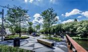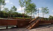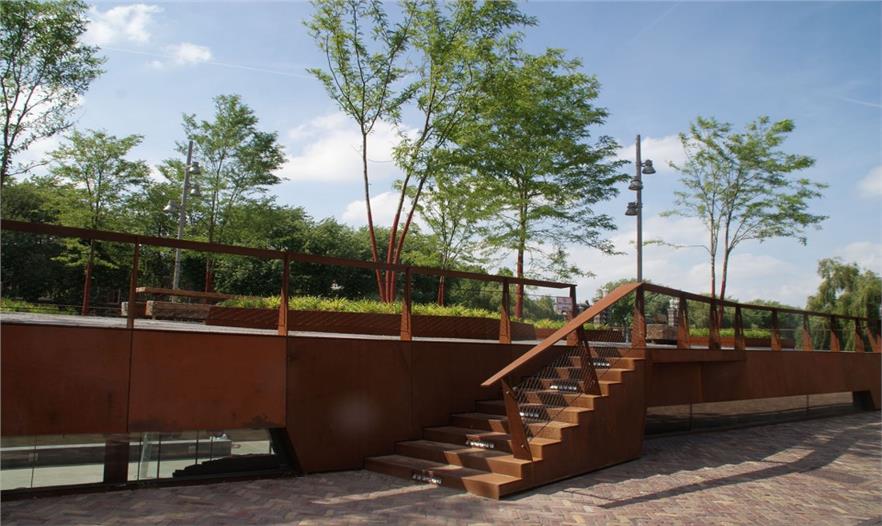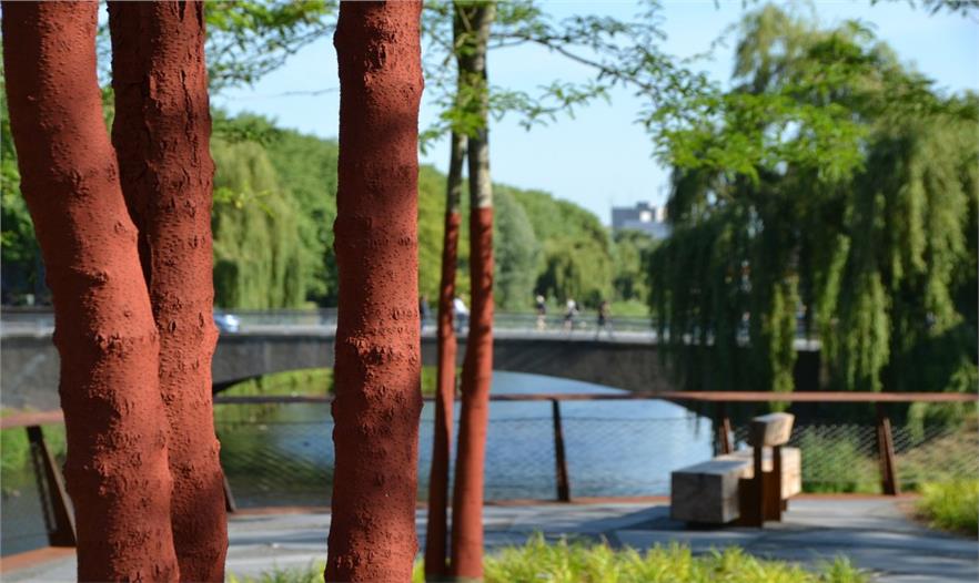 小小的公園面積雖然只有700平方米,但是有充足的休息空間和良好的觀賞河道視野。與此同時,這小小的公園還有愜意的午后日照時光和美麗的黃昏景觀。長凳坐落在樹下,公園里甚至還有一張6米長的野餐桌。在這里享受蔭涼真是再好不過。公園的形式與建筑的折線轉(zhuǎn)角形式相互契合。碎石地面鋪裝上大面積的混凝土磚像是浮冰。碎石地面能方便屋頂植物根部獲得水與空氣。此外耐候鋼也得到了大面積的運用,設計師還別出心裁的把樹干也涂成與耐候鋼相同的顏色,這樣綠色蔥郁的景觀和紅色的耐候鋼(銹蝕鋼板)形成了鮮明的對比。