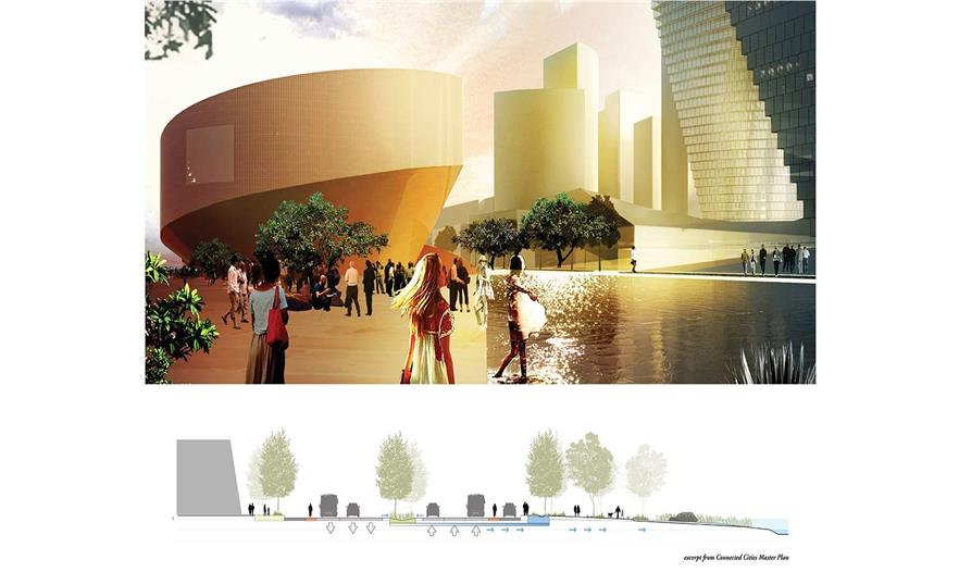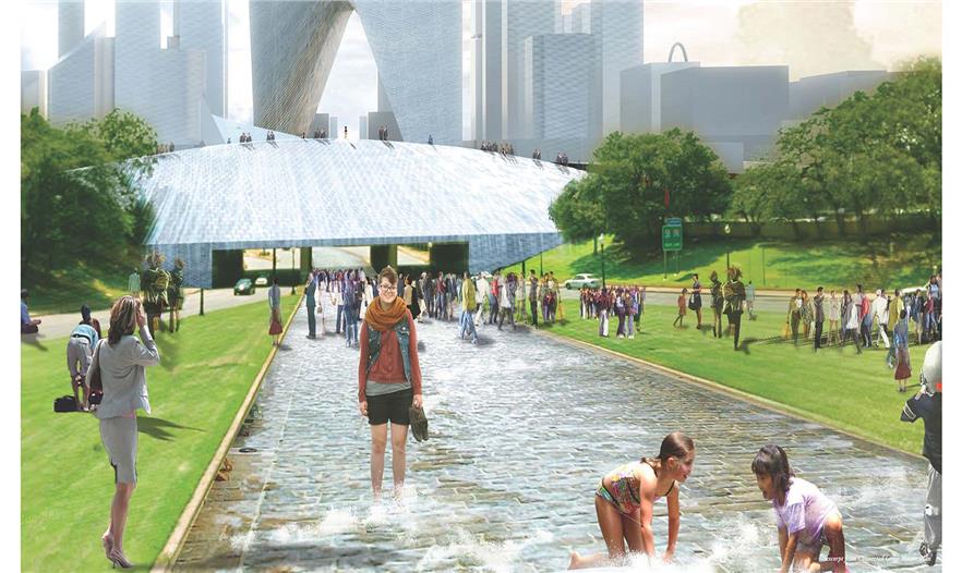 在該區(qū)域內(nèi),2個拱形狀的環(huán)形道定義開發(fā)區(qū),創(chuàng)造出達拉斯市區(qū)和三一河之間的新連接,構(gòu)建新的河流。2個拱形結(jié)構(gòu)與再生的水道和濱河道相交的地方(一系列文化場地和戶外便利設(shè)施區(qū))建立出從北到南的中央通道。