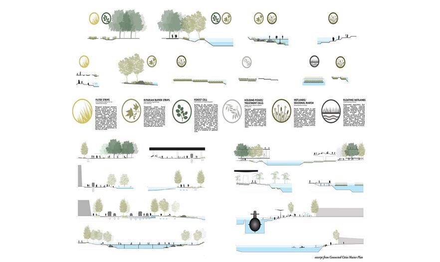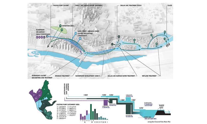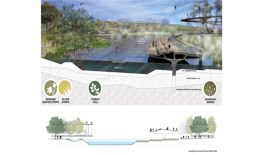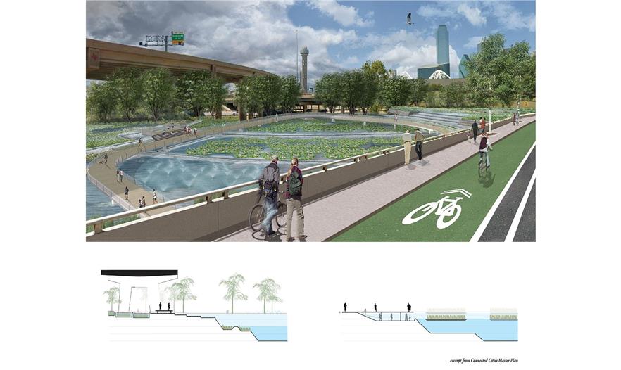 重新將達拉斯與其河流連接以及獲得對旱澇災(zāi)害彈性控制的成果會在三一河水域出現(xiàn)一系列多樣化和分布廣泛的水工程項目。該項目區(qū)域內(nèi)的系統(tǒng)用來緩解三一河泄洪道的壓力以及減少洪澇的危機,公開三一河的子流域,構(gòu)建重新設(shè)想的河流邊緣,收獲、處理和重新引導(dǎo)經(jīng)過該區(qū)域的雨水。