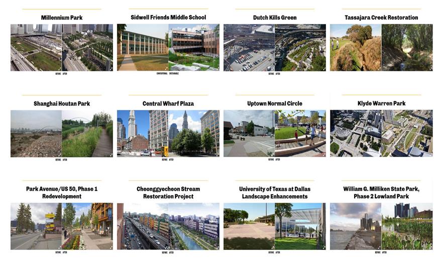 1. 案例分析簡介——一個有100多個典型的建筑景觀項(xiàng)目的數(shù)據(jù)庫,帶有量化的環(huán)境、經(jīng)濟(jì)和社會效益。案例分析簡介包括各式各樣的項(xiàng)目類型、規(guī)模和地理位置。它們由設(shè)計(jì)師和學(xué)術(shù)研究員團(tuán)隊(duì)總結(jié),評估性能和記錄每個項(xiàng)目。60多個主要的事務(wù)所參與到這個程序中,幫助進(jìn)行整理案例分析,如AECOM事務(wù)所、Andropogon事務(wù)所、Conservation Design Forum事務(wù)所、Design Workshop事務(wù)所、EDSA事務(wù)所、Hargreaves Associates事務(wù)所、Michael Van Valkenburgh Associates事務(wù)所、Mithun事務(wù)所、James Burnet事務(wù)所、OLIN事務(wù)所、PWP景觀設(shè)計(jì)事務(wù)所、Raymond Jungles事務(wù)所、Reed Hilderbrand事務(wù)所、Sasaki Associates事務(wù)所、SmithGroupJJR事務(wù)所、Stoss Landscape Urbanism事務(wù)所、SWA事務(wù)所、土人設(shè)計(jì)、WRT事務(wù)所以及ZGF事務(wù)所。案例分析圖書館的數(shù)據(jù)庫是可下載的,引導(dǎo)關(guān)于項(xiàng)目內(nèi)景觀性能效益的研究。