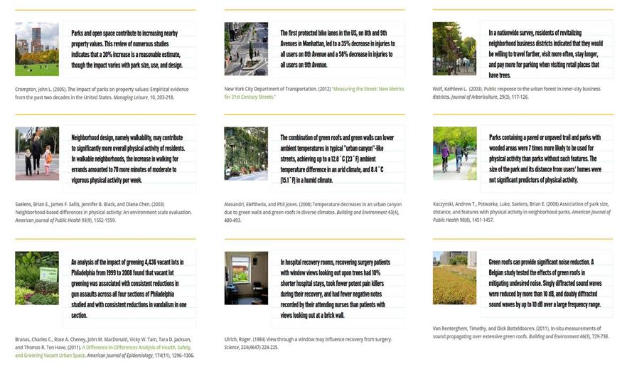 2. 快速參考圖書館——120多個景觀效益簡短的總結(jié),從發(fā)表的研究中摘取。這些快速參考內(nèi)容跨越幾十年的科學(xué)研究,每個資料展示出景觀多個和驚奇效益中的一個,為客戶、社區(qū)或決策者列舉出可持續(xù)景觀方案的案例。每個資料都包括引用和鏈接,可以看到全文。