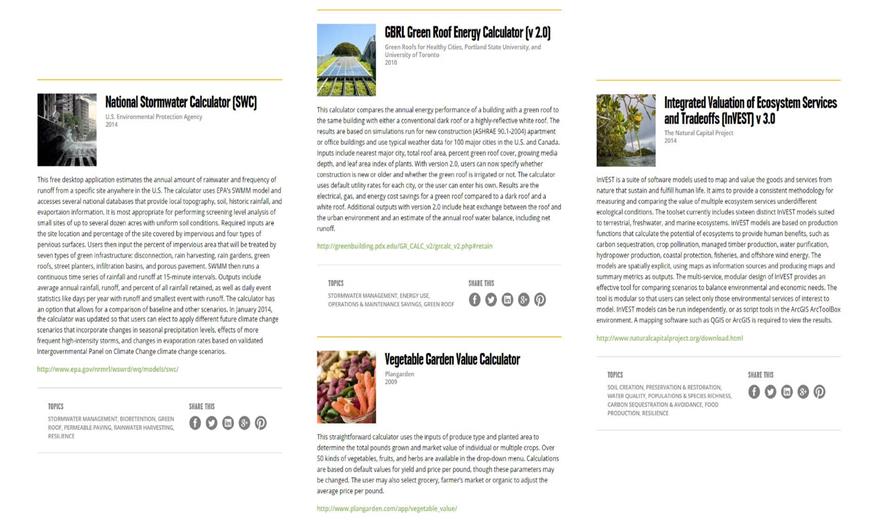3. 效益工具包——幾十個在線計(jì)算器和工具來估算景觀性能。免費(fèi)的工具從全國適應(yīng)的簡單的計(jì)算器到地理位置特定的工作表。當(dāng)真實(shí)的測量方法不能用時(shí),這些工具也能被用來為完工的項(xiàng)目估算特定的景觀性能,或者是用在設(shè)計(jì)階段的多個選擇中對比預(yù)測的效益。許多工具也能讓用戶對比傳統(tǒng)和可持續(xù)設(shè)計(jì)的生命周期的成本。
