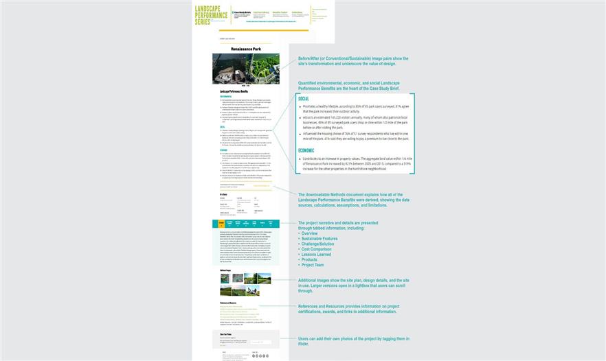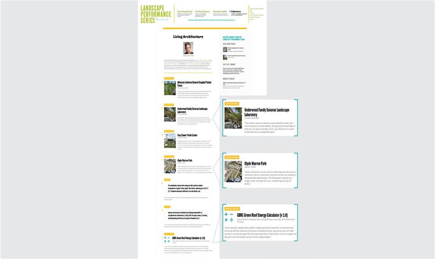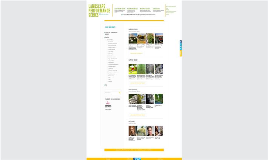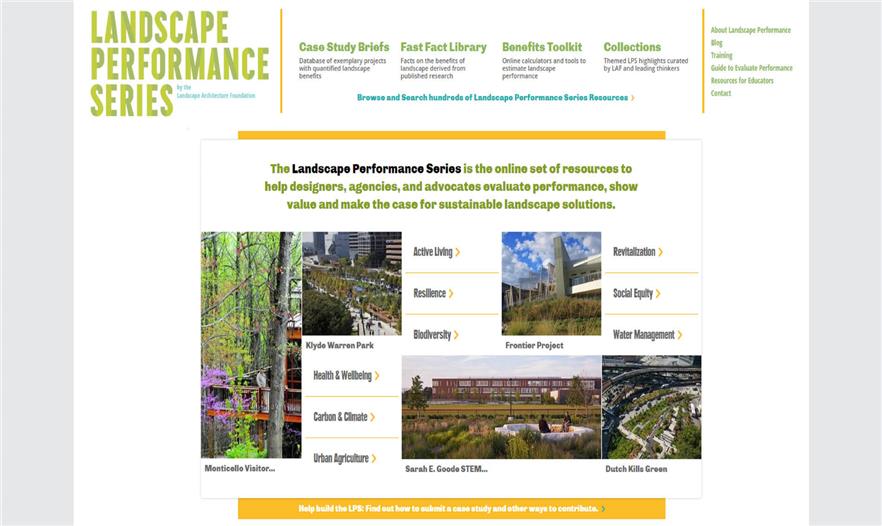 景觀性能系列是一種網(wǎng)上資源,增強(qiáng)能力和改造在設(shè)計(jì)和發(fā)展程序中評價(jià)景觀的方法。它將研究、工業(yè)、學(xué)術(shù)界和專業(yè)實(shí)踐中的信息和創(chuàng)新結(jié)合起來,以100個案例研究簡介、120個快速參考、幾十個效益計(jì)算工具(Benefits Toolkit calculators)以及思想領(lǐng)袖編篡的收集形式展現(xiàn)。這個有條理、直覺性和資源豐富的網(wǎng)站有一個可以搜查的數(shù)據(jù)庫以及精細(xì)的內(nèi)容搜索工具,幫助使用者定位相關(guān)的信息。由于70多萬的頁面瀏覽量,景觀性能系列已經(jīng)成為每年5萬用戶尋找設(shè)計(jì)案例、展示價(jià)值以及尋找可持續(xù)景觀方案案例的地方。這個網(wǎng)站是一種空前的資源,促進(jìn)研究、信息共享和對話,獲得空前廣泛的用戶,傳達(dá)、履行、建造、維持和提倡可持續(xù)性、彈性和高性能的景觀。