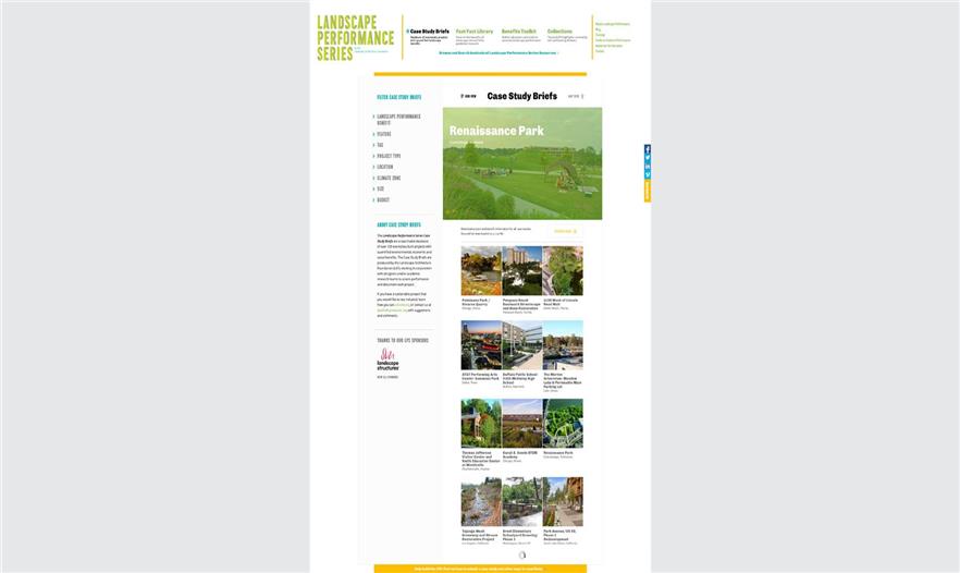 自2010年開始,該網(wǎng)站的資源數(shù)量和網(wǎng)站使用率大幅度上升,每年流量平均增長30%。在認(rèn)識到其巨大的價(jià)值和潛力,2014年景觀性能系列以獨(dú)立網(wǎng)站形式進(jìn)行重新設(shè)計(jì)和建立:LandscapePeformance.org。新網(wǎng)站基于用戶和戰(zhàn)略群眾的回饋建立,它是直覺性的,資源更加豐富,將新模塊、功能和方法結(jié)合起來編輯和展示內(nèi)容。由于精細(xì)的內(nèi)容搜索工具從強(qiáng)化的搜索能力到多層內(nèi)容過濾和相關(guān)內(nèi)容推薦,景觀性能系列幫助用戶發(fā)現(xiàn)了他們沒有找到的相關(guān)信息。