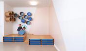 這里面還有一個小屋,激發(fā)孩子們的想象力。其他深的木制窗戶被設計成散熱器蓋、書架、座位和長椅,還有小通道讓孩子們自由的穿梭房間。在午睡室,床墊和毯子以有效的方式儲存,增加設計元素。當然,孩子們還可以在隱藏的黑板上作畫。