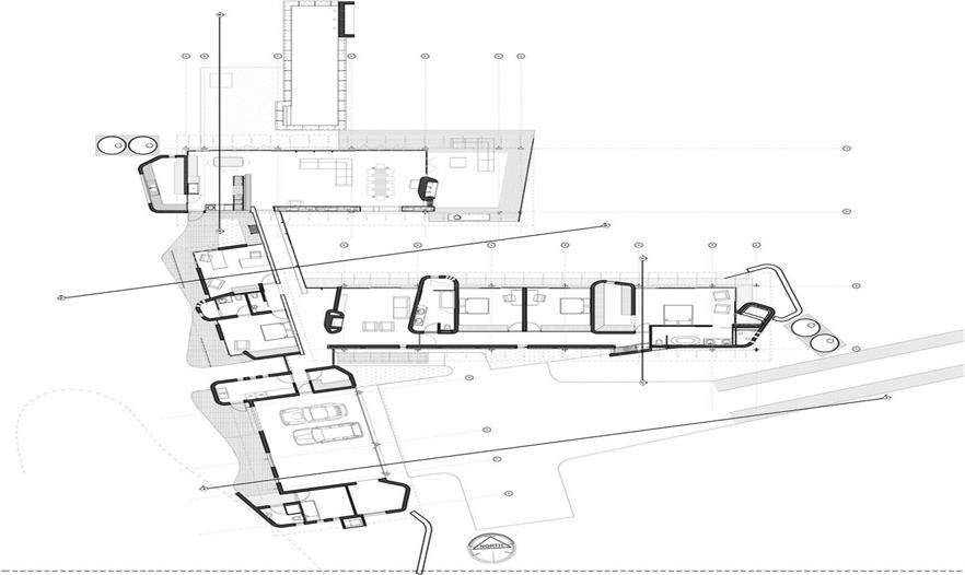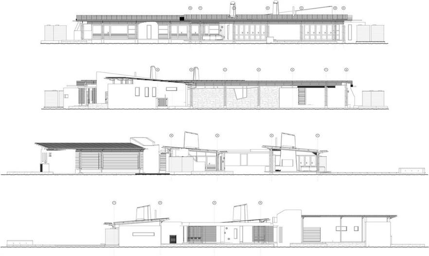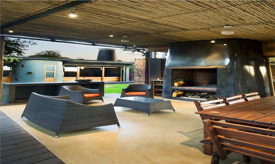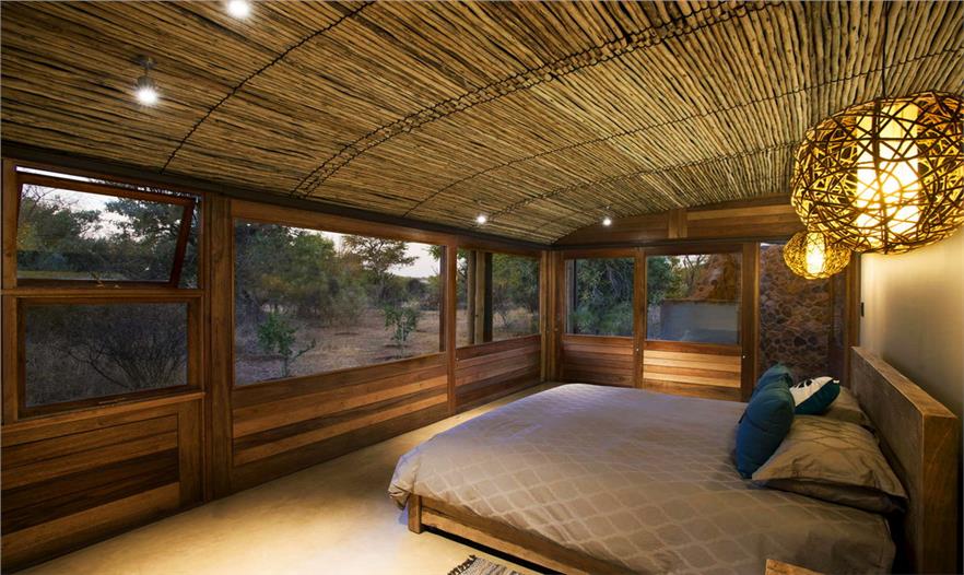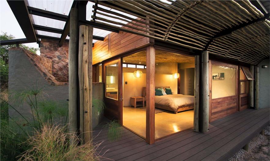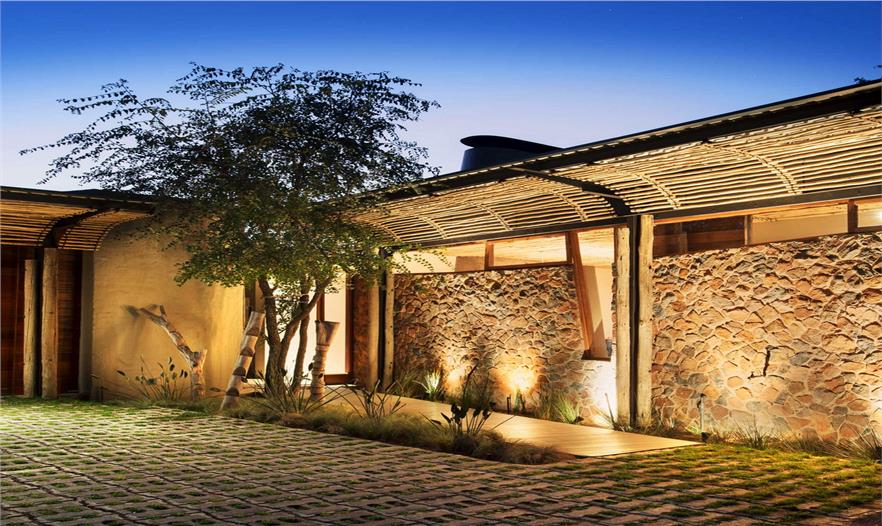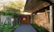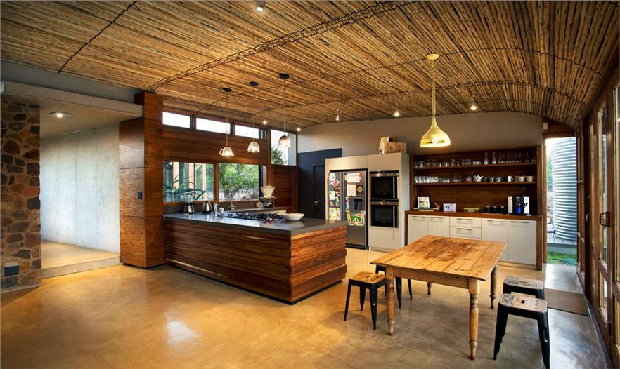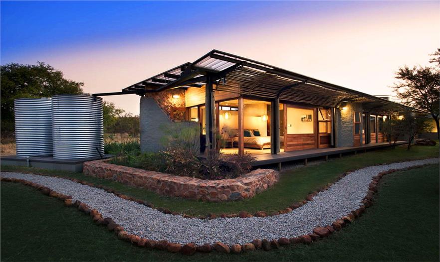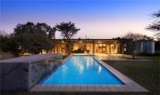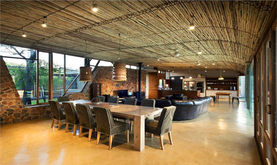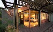 客戶要求在一塊灌木叢生的基地上設(shè)計(jì)一個四口之家?;卣嫉?公頃,坐落在Roodeplaat水庫下游。建筑物被仔細(xì)地安置在原有的樹林之間??蛷d、臥室、服務(wù)和客房四個單元被連接成一個整體,并且圍合出一個庭院。最小的屋頂高度在創(chuàng)造家庭空間的同時確保對自然環(huán)境的低視覺沖擊。建筑的基本結(jié)構(gòu)是木條填充的鋼制屋頂,下面是砌體墻壁。