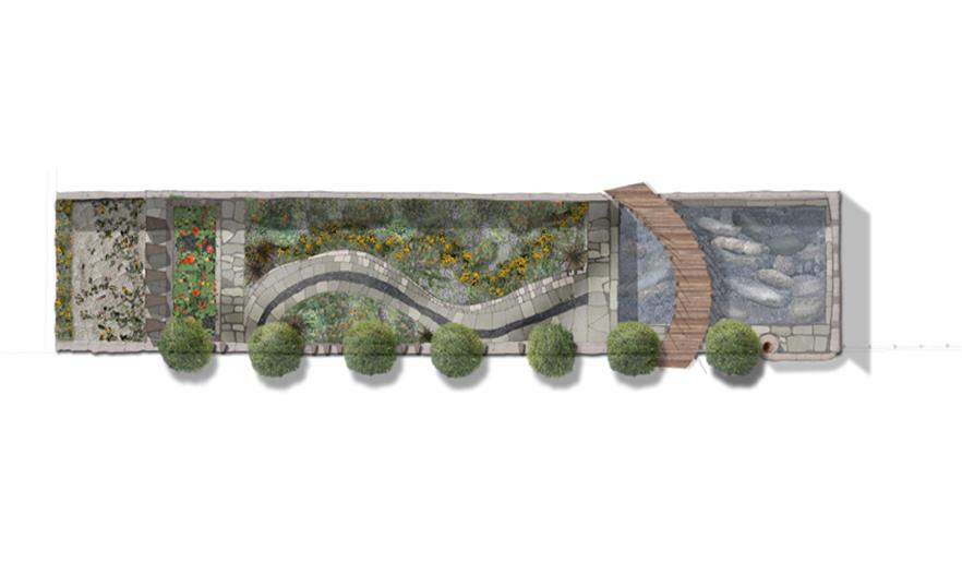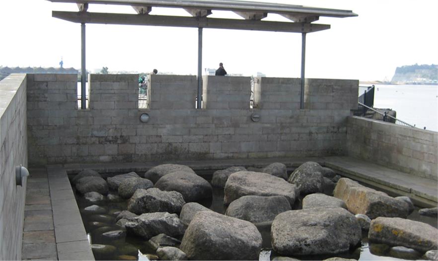 這個(gè)海洋花園利用海洋植物和三個(gè)水池(一個(gè)源流池、一個(gè)種植植被的水池和一個(gè)大型的淺水池)再現(xiàn)海洋特征。這個(gè)花園三面環(huán)繞著一面墻壁,使用迪恩森林里淺灰色的石頭建造。這面墻壁挖有水渠,這樣能瞥到到海洋的景色。