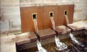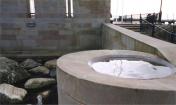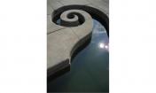 石頭和木材構(gòu)成單色調(diào)由一個(gè)銅碗和銅墻跌水得到改善,并將天空的顏色映射到花園里。