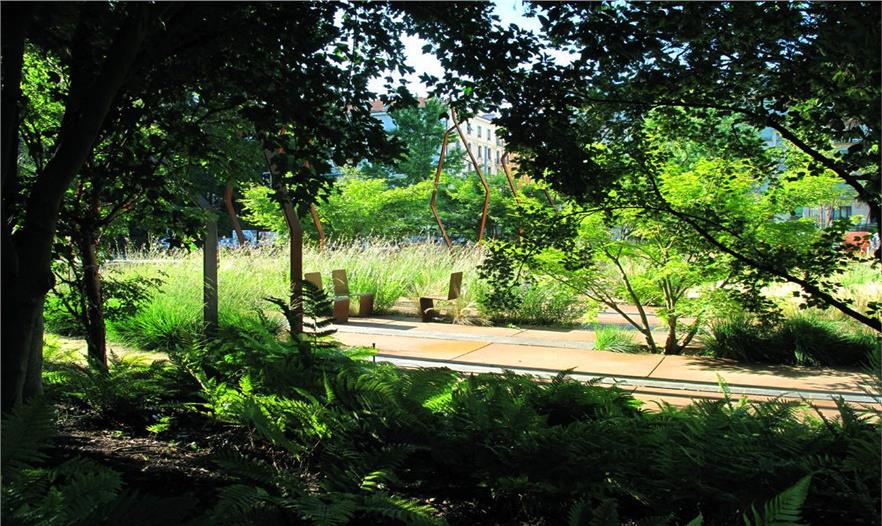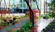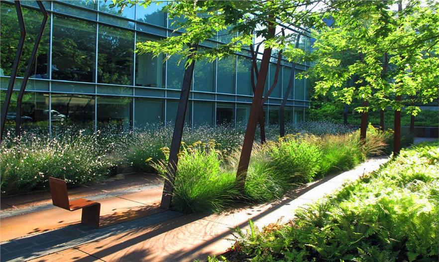 FloorWorks,是一個對公眾開放的花園,這個花園環(huán)繞著日內(nèi)瓦的公司總部,而它的意義就等同于WallWorks,WallWorks是一部當代藝術(shù)家的裝飾建筑作品集,這些藝術(shù)家包括JamesTurrell,Cindy Sherman和SolLe Witt。FloorWorks就是指我們怎么樣創(chuàng)造地面,也就是說,通過操作園藝中可用礦物和生活資料來創(chuàng)造。該項目設(shè)計了一個獨特的支撐方式,通過在各種功能元素之間建立聯(lián)系,使這些元素從原有的限制中釋放出來。只有一種惰性材料,也就是COR-10鋼,已經(jīng)被用于建造這個項目。這些連續(xù)的線條搖擺著,而紅色的鋼材地板根據(jù)地形和需要被折疊或扭曲,并被應(yīng)用于整個花園的各處。這些鋼板的邊緣被切割和折疊,有些為攀援植物提供支撐,有的則變成座椅,供人使用?;剡吘壐叽髽淠镜氖褂?,使得整個區(qū)域更加蔥郁,而且也使得整個場地的布局更加完整。