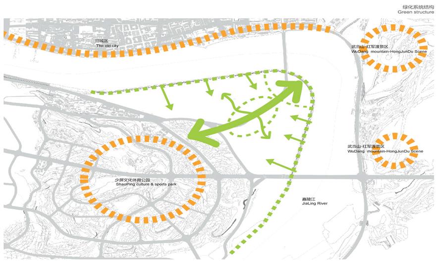 針對杜里壩場地特色,以更理想、更自立的城市濱江景觀地標(biāo)的方式創(chuàng)造出濱江綠地與河流廊道,在蒼溪城市化進(jìn)程中保留山水與人文綠色基底;以新生態(tài)城市主義理念,融入都市休閑設(shè)施與生態(tài)旅游服務(wù)功能,營造生態(tài)形象展示與獨(dú)特地域景觀地標(biāo)的公共濱水景觀空間。