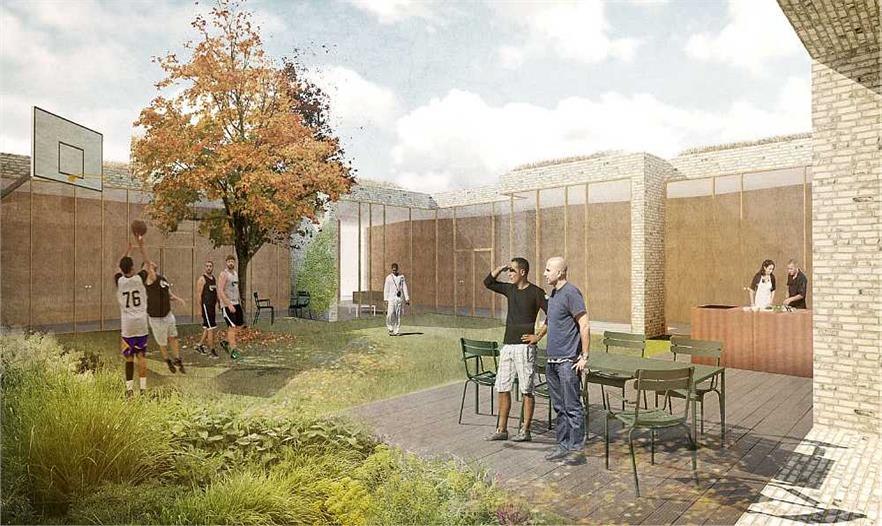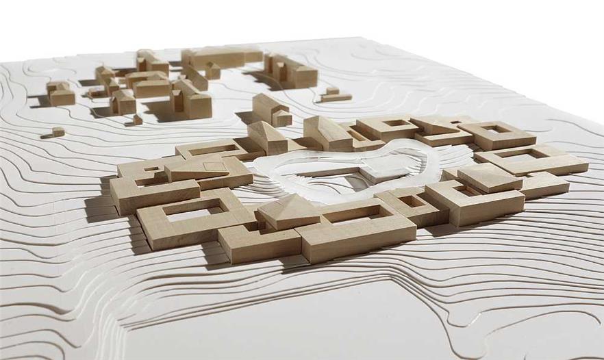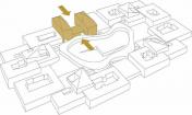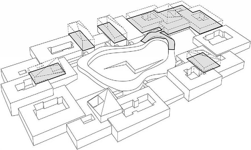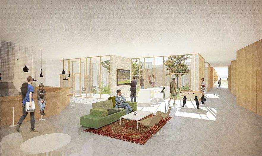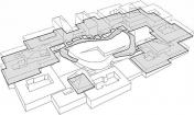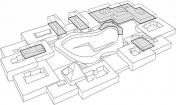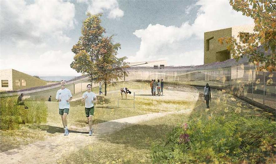 其基本概念是一個(gè)階梯狀的建筑布局,簡(jiǎn)單的建筑形式,多變且能被取代完美地穿插到景觀中。這個(gè)建筑群沒有墻壁環(huán)繞,其本身構(gòu)成了安全邊界,環(huán)繞一個(gè)大型、綠色的景觀,同時(shí)觀賞羅斯基勒峽灣的美景。