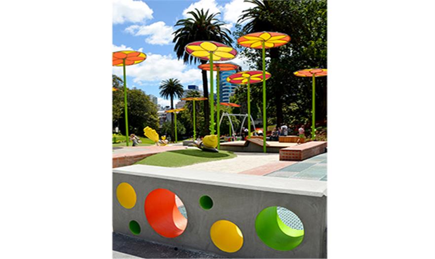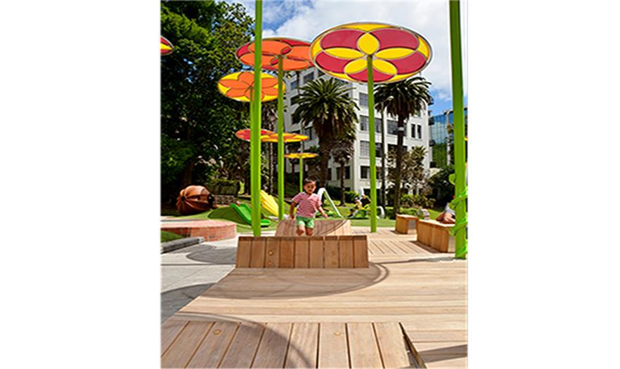 邁爾斯公園游樂區(qū)以“后院中的娛樂區(qū)”為主題設(shè)計,是一個放大化的雕塑花園。在明亮、五彩、圓盤狀的“花朵”下面,孩子們可以蕩秋千,在蔓生的“南瓜藤”和大型滲透性“樹葉”中攀爬穿行、滾球、玩滑梯或者在巨大的花園鳥和昆蟲設(shè)施上玩樂。