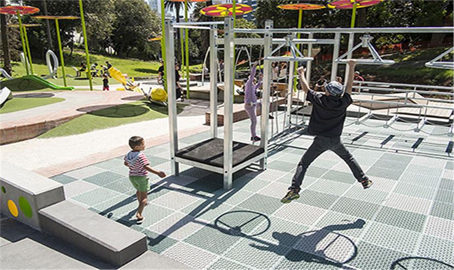 該游樂區(qū)需要迎合各種游客和日常使用者的需求,平衡體育活動與創(chuàng)意性游樂和社會交流之間的關(guān)系。傳統(tǒng)的游樂元素如秋千和滑梯都有雕塑性、互動性和奇怪的特征。在這個緊密的區(qū)域,每個表面都有畫面感和有趣,包括墻壁、邊緣、甲板和道路。