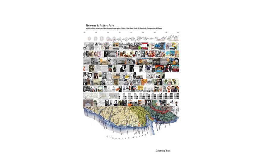 研究陳述:新澤西州阿斯伯里是因搖滾樂標(biāo)志人物布魯斯•斯普林斯汀而聞名的沙灘社區(qū)以及一個典型的案例,這個研究就是利用這個地方進(jìn)行的,其背景和年代表探索了分層的時間線,顯現(xiàn)新澤西海灘復(fù)雜的實際和文化歷史。研究來源:歷史地理地圖和天氣數(shù)據(jù)、人口普查資料、阿什伯公園新聞以及孟莫斯郡檔案、阿斯伯里歷史協(xié)會以及報紙微縮膠卷和技術(shù)、氣候變化和海平面上升的環(huán)境研究。