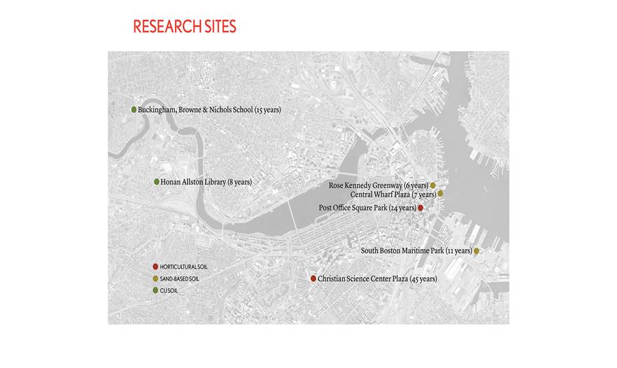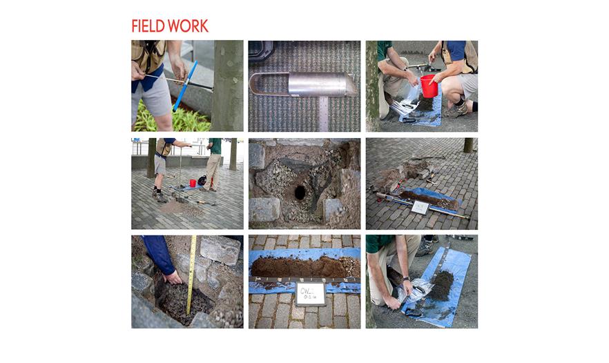為此,2位景觀設(shè)計(jì)師、1位樹木研究者以及1位土壤科學(xué)家對(duì)生存在波士頓城市環(huán)境中4——45年的植物進(jìn)行一個(gè)對(duì)比研究,方法是實(shí)地調(diào)查和實(shí)驗(yàn)測(cè)試。我們想要了解這些樹木是怎樣生長(zhǎng)的以及土壤的性能如何。我們的目標(biāo)不在于選出最優(yōu)的種植策略,但要了解這些復(fù)雜系統(tǒng)的動(dòng)向(如我們看不到的地下活動(dòng))以及評(píng)估這些結(jié)果是否值得投資。