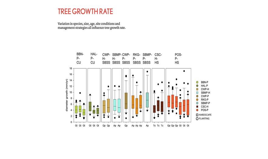 這個(gè)項(xiàng)目由2家當(dāng)?shù)厥聞?wù)所的景觀設(shè)計(jì)師和2位實(shí)踐科學(xué)家共同完成和上交——這種合作需要有嚴(yán)格的指標(biāo)。最后的數(shù)據(jù)集在規(guī)模上是有限的,但是明確的顯示出我們?cè)鯓舆x擇正確的土壤系統(tǒng)提升城市樹木的壽命和健康以及為客戶提供維護(hù)此系統(tǒng)的策略。我們團(tuán)隊(duì)也發(fā)展了一些新穎的繪畫類型向科學(xué)家和景觀設(shè)計(jì)師闡釋基線數(shù)據(jù)和發(fā)現(xiàn)。我們會(huì)持續(xù)參與這個(gè)項(xiàng)目,從全國(guó)各個(gè)區(qū)域收集大眾數(shù)據(jù),尋找擴(kuò)大我們數(shù)據(jù)集的實(shí)施策略。這只是一個(gè)開始而已。