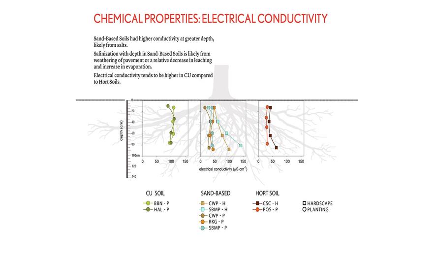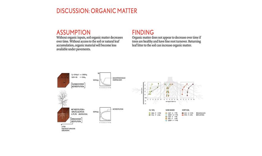 發(fā)現(xiàn):數(shù)據(jù)顯示出城市土壤,即使是鋪裝路面下的土壤隨著時(shí)間的發(fā)展是動(dòng)態(tài)的。它們變化和成熟的水平,就像本土土壤一樣。這項(xiàng)研究也證明或改正關(guān)于鋪裝路面下土壤的一些普通見解:有機(jī)物因落葉層的缺乏而減少(假);隨著時(shí)間的發(fā)展,土壤中的粘土隨著下滲而減少(真);當(dāng)鋪裝路面時(shí),樹木生長(zhǎng)會(huì)緩慢(真)。同樣重要的是,這個(gè)數(shù)據(jù)顯示出景觀建造后的維護(hù)比任何特定的土壤更能顯示出樹木的健康狀況。