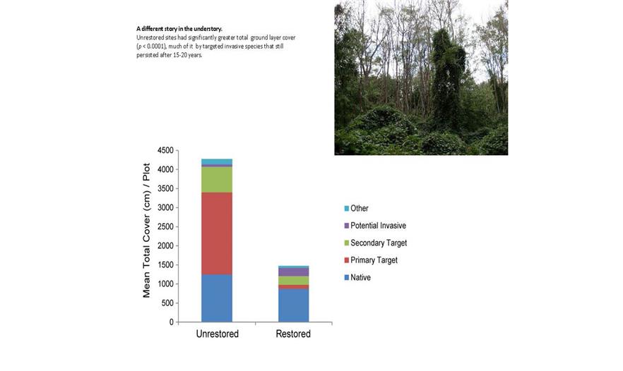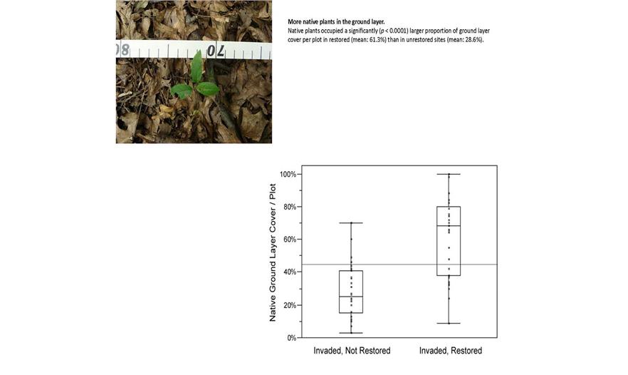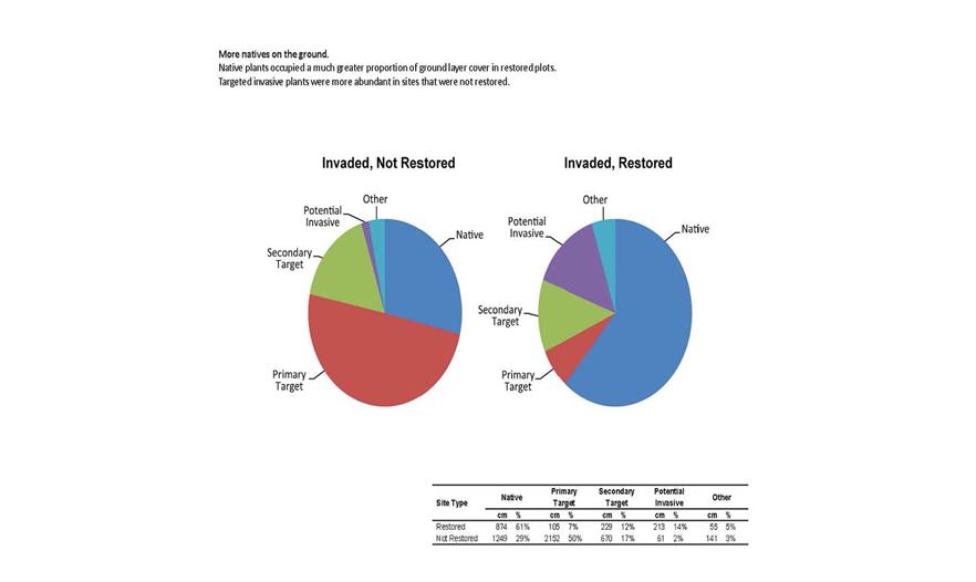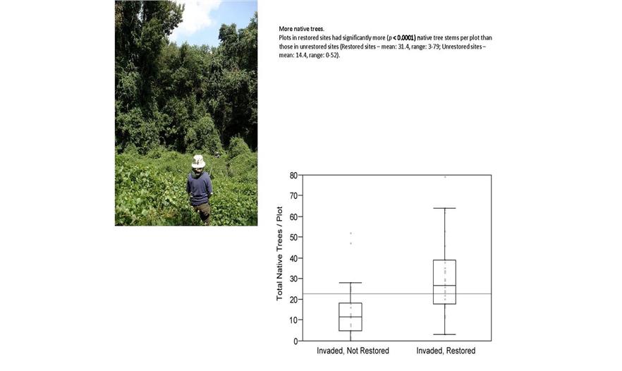 沒(méi)有被修復(fù)的入侵區(qū)域本土植物覆蓋只占29%,而修復(fù)區(qū)域本土覆蓋占61%。修復(fù)區(qū)域樹(shù)木總數(shù)(每個(gè)地塊的本土樹(shù)木和本土樹(shù)木幼苗)要多。目標(biāo)化的入侵物種覆蓋在未修復(fù)的區(qū)域占50%,在修復(fù)區(qū)域只占7%。