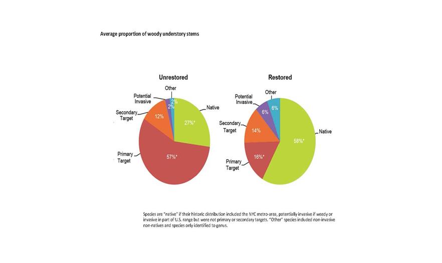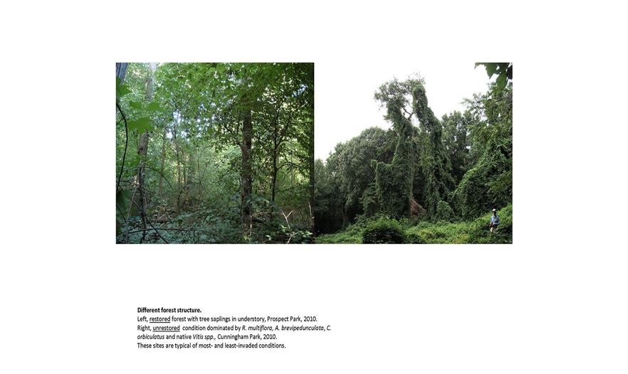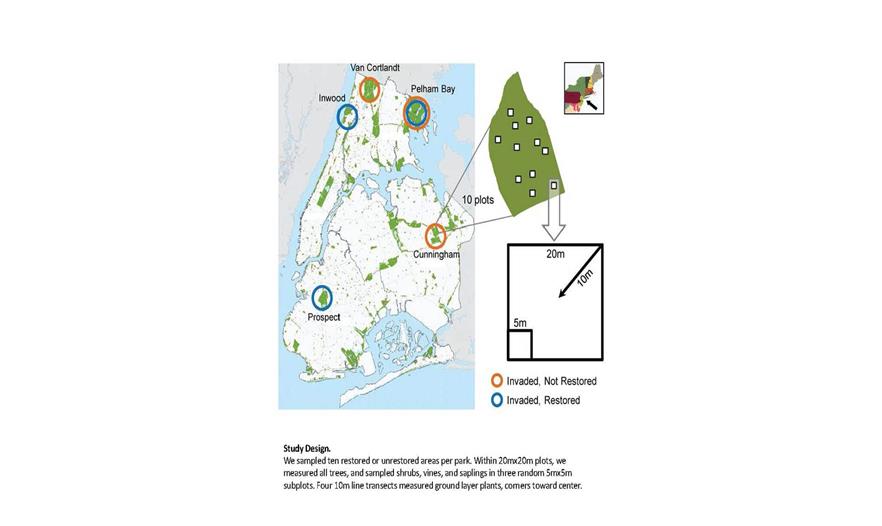 我們測(cè)試了本土和設(shè)計(jì)的森林結(jié)構(gòu)以及植物群落變化的成分和軌跡是否能夠通過(guò)移除入侵性木質(zhì)物種和種植本土植物修復(fù)城市森林。我們?cè)u(píng)估了修復(fù)區(qū)域中30個(gè)20米×20米地塊現(xiàn)有的生態(tài)條件,就是第一次治理15——20年后植物社區(qū)的情況。我們揭開(kāi)了修復(fù)工作開(kāi)始時(shí)公園局使用的區(qū)域和方法,也就是15——20年之前的情況,然后和員工在此區(qū)域工作2年取樣整個(gè)區(qū)域的植被結(jié)構(gòu)和成分。我們將修復(fù)森林與30個(gè)同等面積的紐約城市花園森林地塊(也受到木質(zhì)植物的入侵,但沒(méi)有修復(fù))進(jìn)行對(duì)比。這個(gè)數(shù)據(jù)集包括8000多個(gè)木質(zhì)莖以及2000多個(gè)超過(guò)200多個(gè)品種的草本植物的辨別和測(cè)量。