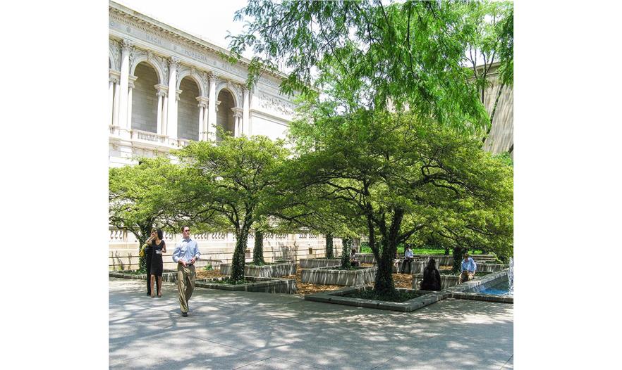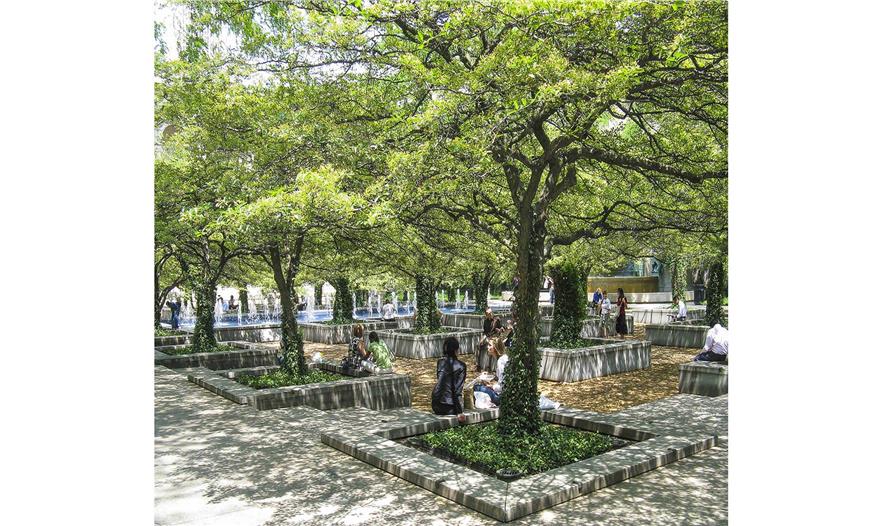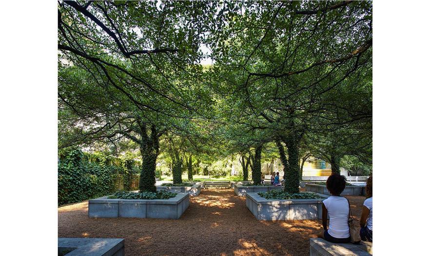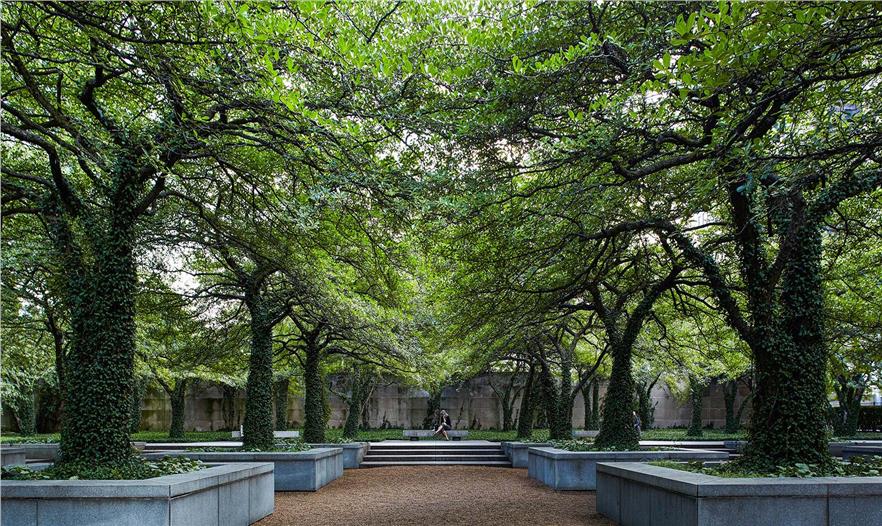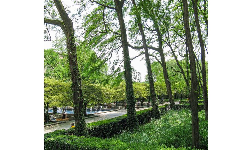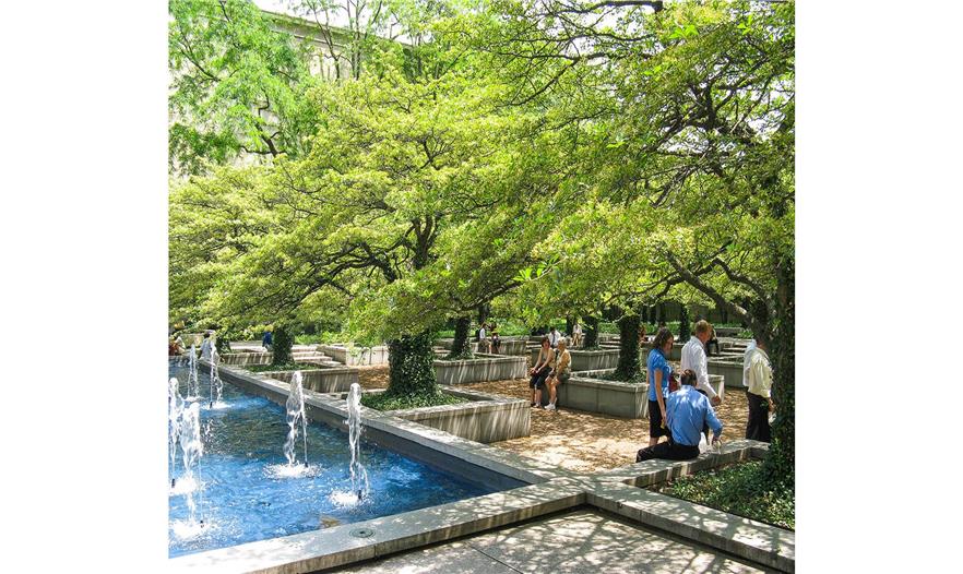 花盆既具有功能性又有美學(xué)價(jià)值:花盆76厘米(30英寸)上是寬闊的大理石邊緣,為整個(gè)花園提供座位;營(yíng)造花園結(jié)構(gòu);增加地面的土壤深度,提升樹(shù)木的高度,為游客提供陰涼。在該空間的后面是Taft噴泉,周圍環(huán)繞著皂莢樹(shù)和開(kāi)花的灌木。