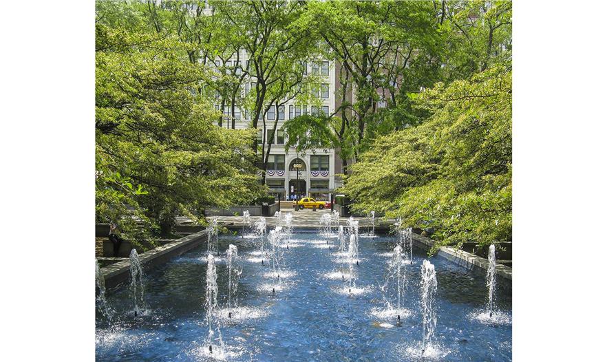 凱利表示“我的設(shè)計(jì)意圖是營(yíng)造戲劇化的氛圍:增強(qiáng)在城市內(nèi)橫穿樹(shù)林的感覺(jué),之后突然發(fā)現(xiàn)自己在一個(gè)水池周邊的美景前,之后又被漂亮的雕塑所吸引。”潛式噴泉活躍水面。在樹(shù)木周圍,花盆的景色隨著季節(jié)變化而變化,為該空間增添了色彩。該空間東邊沿線的長(zhǎng)形低地花壇中還是種有山楂樹(shù)。