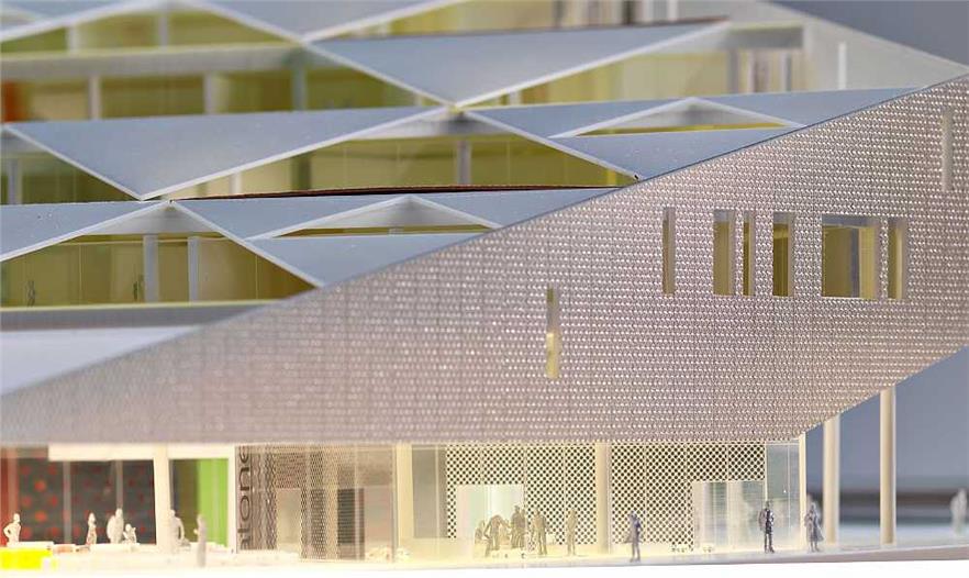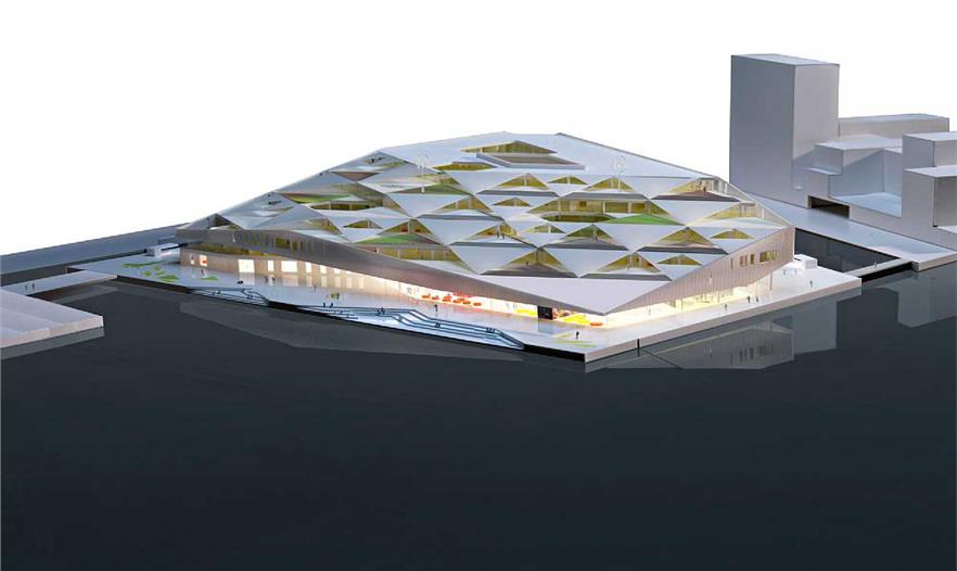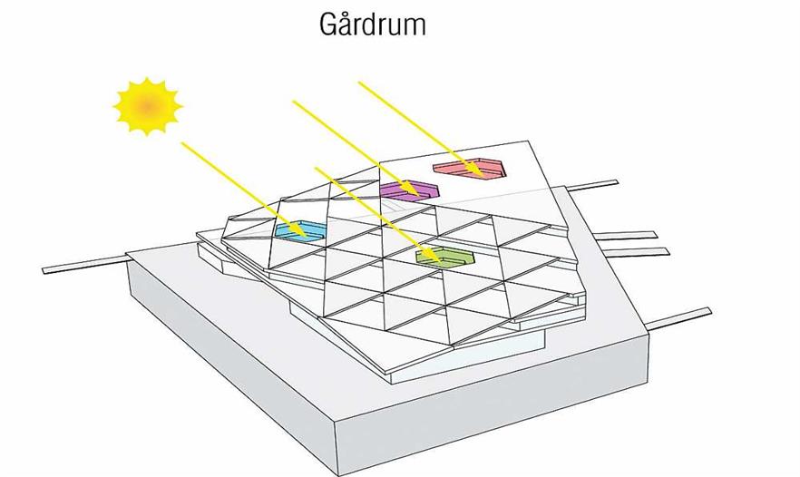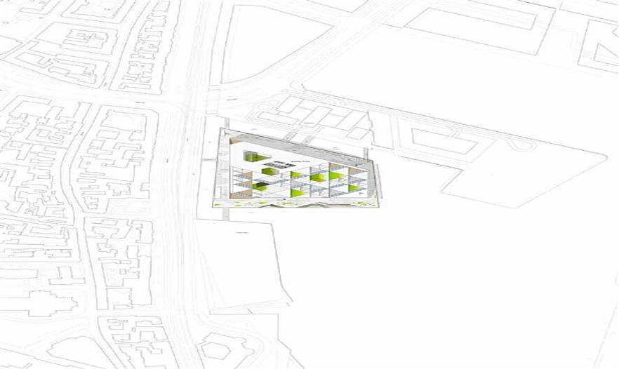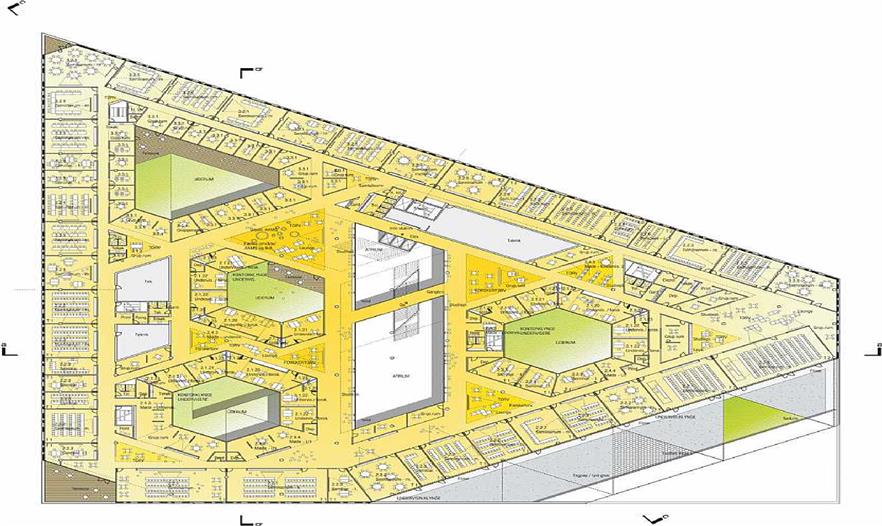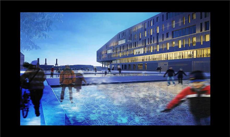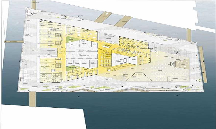 其傾斜的屋頂是該競賽方案的主要元素,賦予這個新建筑一大特色。其屋頂本身就是一個景觀,而綜合性的庭院、臺地和試驗(yàn)區(qū)用于教育和研究,建造出一座充滿活力的建筑。人們通過臺地能觀賞到海港和水邊的景色,拉近與人們之間的距離。同時,其建造的目的就是與現(xiàn)有的城市輪廓融合,留下最少的陰影,從周圍的建筑中能清楚地觀賞到海港的景色。還有就是使NAVITAS園在可持續(xù)能源和技術(shù)上成為國際領(lǐng)先者,充分利用冬季溫差,使用加強(qiáng)版的隔離系統(tǒng)、太陽能電池和熱泵,被劃分成低能耗1級建筑。