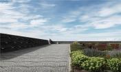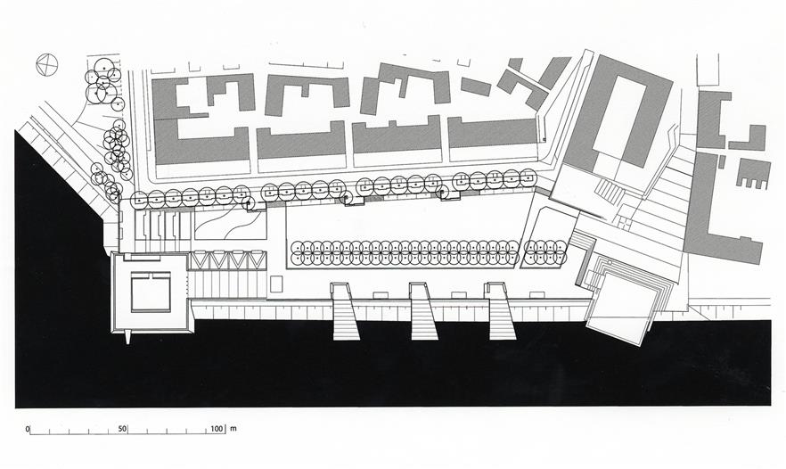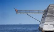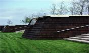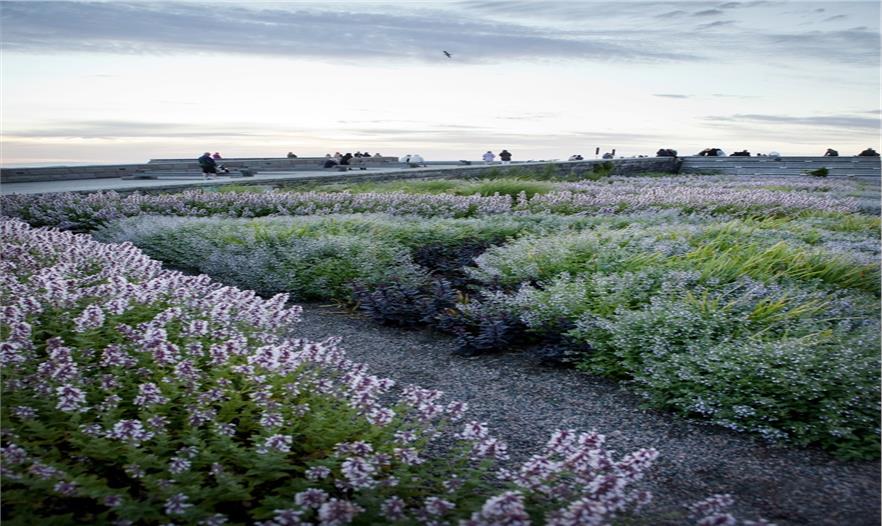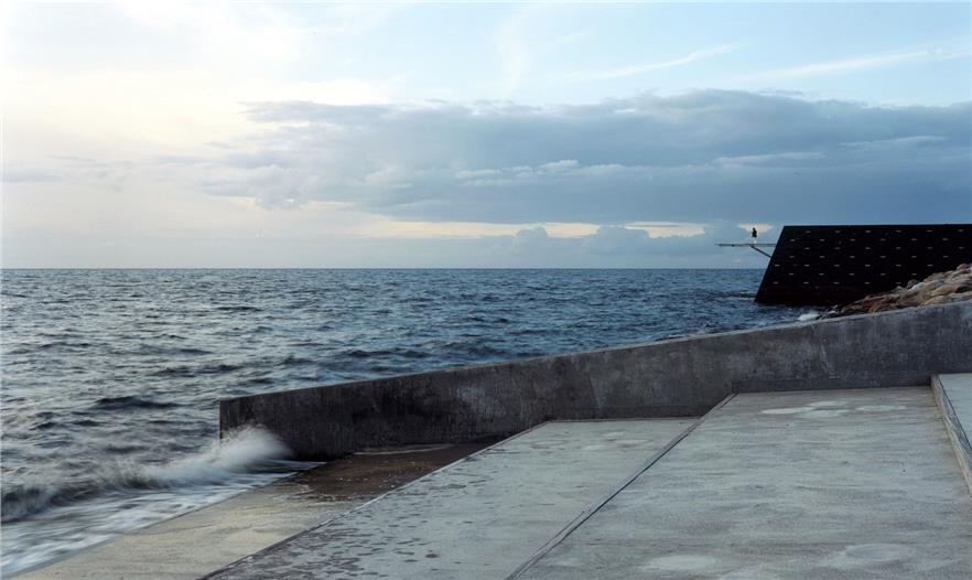 公園的主要特點是設(shè)置了瞭望臺:三個傾斜的混凝土平面穿過粗礫的海岸線,使得公園的游客可以臨近大海。40米X40米的平臺被稱為堡壘,高于海平面 6米以上,大海使游客完全暴露在這里,無論是嚴(yán)酷的風(fēng)或是美麗的黃昏。此外,三個木箱式的平臺,可以俯瞰遼闊的,微微凹陷的草坪。這個活動場地有雙排的花楸屬樹木和低灌木,可以阻擋部分海風(fēng)。