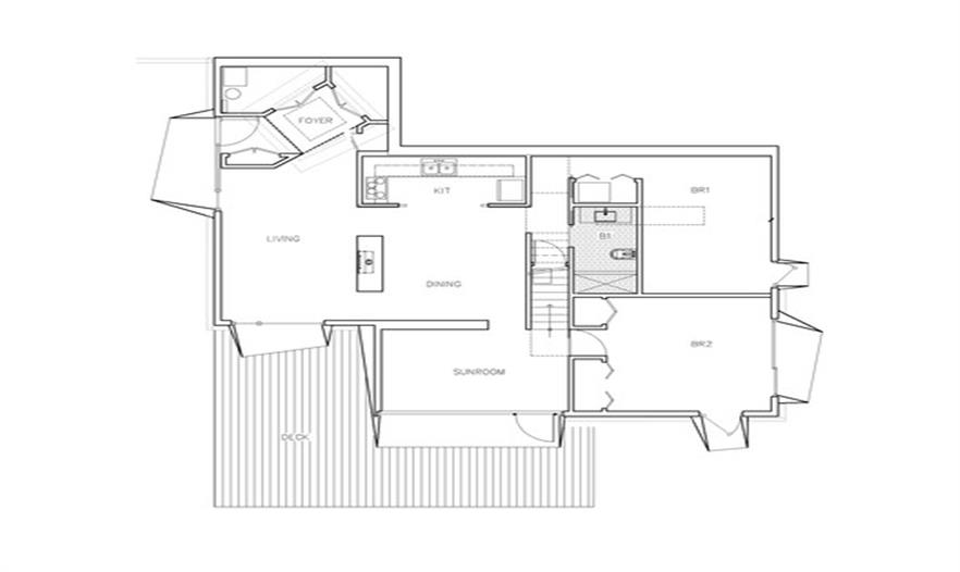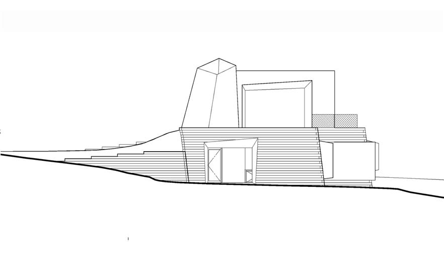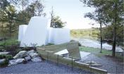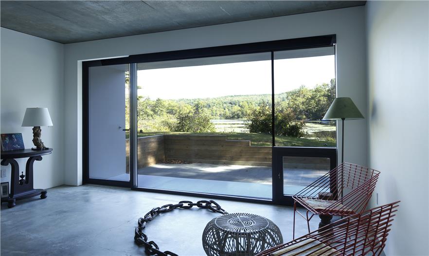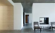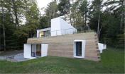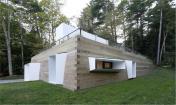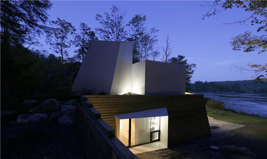 這棟住宅位于馬薩諸塞州西部,房子與場(chǎng)地邊上湖泊保持著二元關(guān)系。從街道上看時(shí),建筑的形式很抽象,看不到任何開口。但當(dāng)你走下人行道,來到它面前的時(shí)候,它是面向湖泊開放的。建筑的墻壁采用了木板堆疊的方式,它既是被住宅嵌入的地形的擋土墻,也是住宅的主要圍墻。一系列開口被當(dāng)成了空間的漏洞,它們穿透了木材墻壁,使得內(nèi)部空間可以向外延伸,從而可以欣賞到非常獨(dú)特的湖泊風(fēng)景。