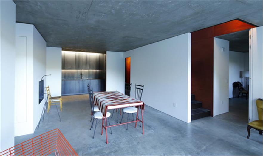 當(dāng)你穿過一個(gè)開口并進(jìn)入住宅的內(nèi)部空間的時(shí)候,會(huì)看到兩個(gè)不同的空間定向 - 一個(gè)是水平定向空間,它被定義為朝向湖泊的開口;另一個(gè)是垂直定向空間,它被定義為朝向天空的開口。每個(gè)類型的空間它們的重要性是不一樣的。比如說水平定向空間的特色就是使用的材料為中性色調(diào)。而垂直定向空間的特色則是通過天窗能夠看到天空,并且使用了很多不同的材料;入口門廊使用的是堆疊的膠合板、廚房使用的是熱軋鋼,樓梯則使用的是生銹的鋼材??v覽整個(gè)房子,這些垂直空間有一種電影中的“硬切”感覺,它打斷了現(xiàn)代連續(xù)流動(dòng)空間的概念,因?yàn)樗麄儗⒆约簷M在了有更多自然特征的水平空間之間。