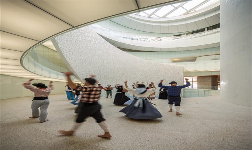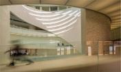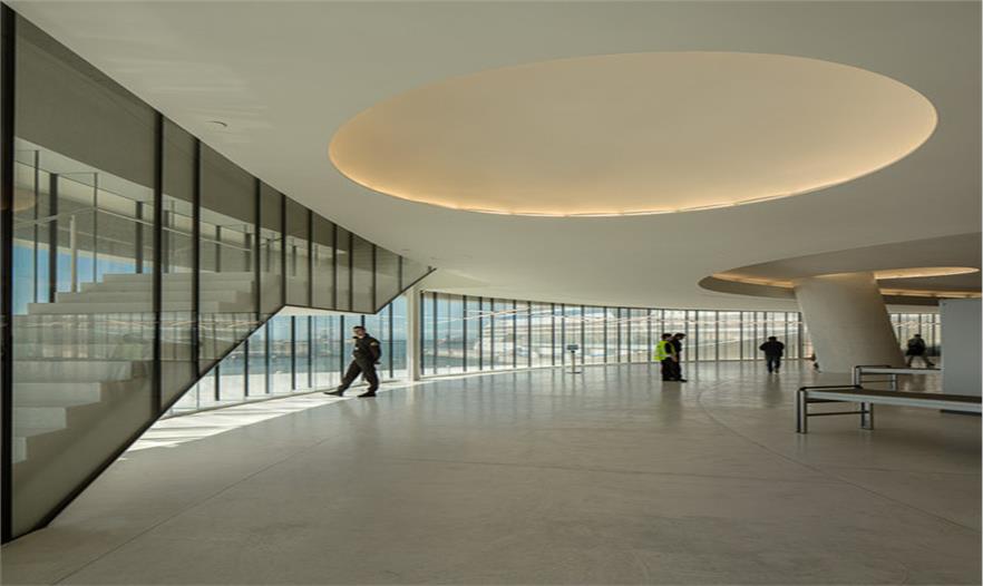 在建筑內部,一系列的功能領域排列出了一個多樣的空間,并且共生在同一個彎曲面上,所用的材料和光線構成了一個統(tǒng)一的空間。這是整個項目的核心部分,擁有四倍高度的空間。