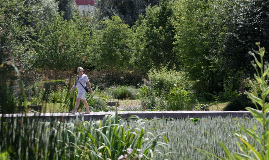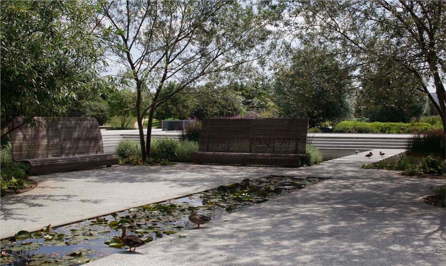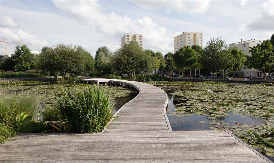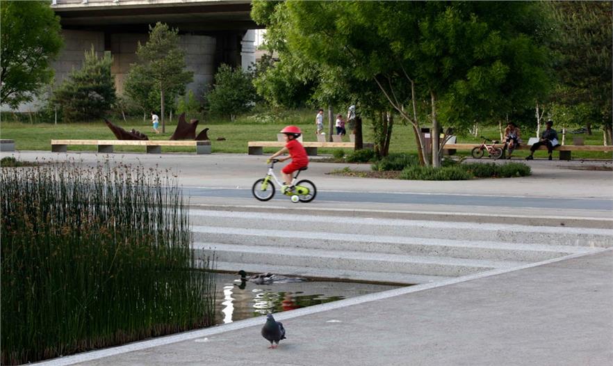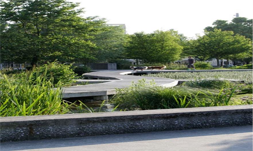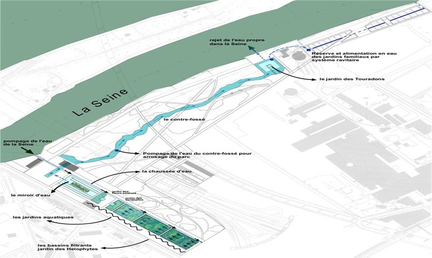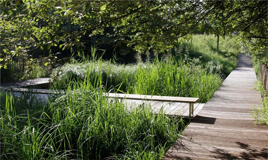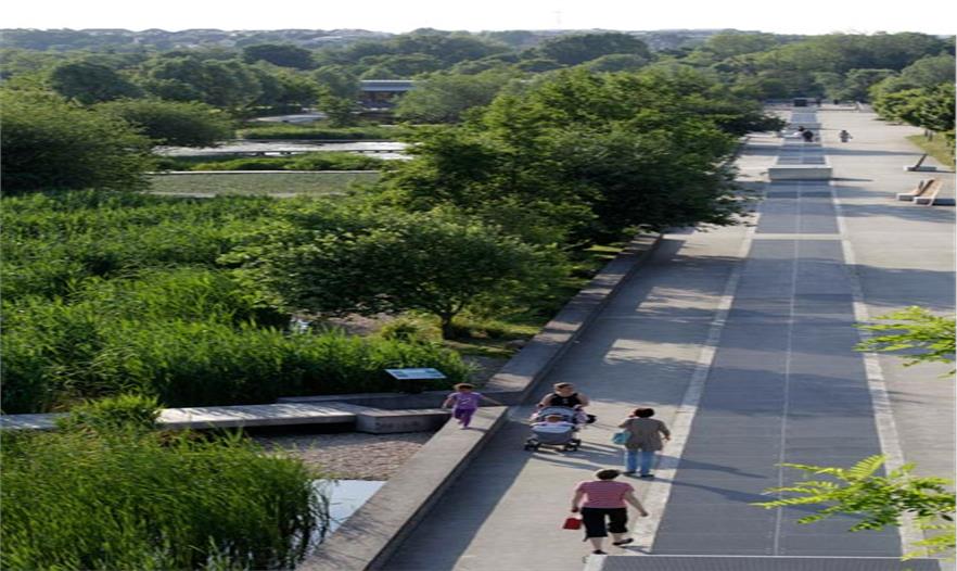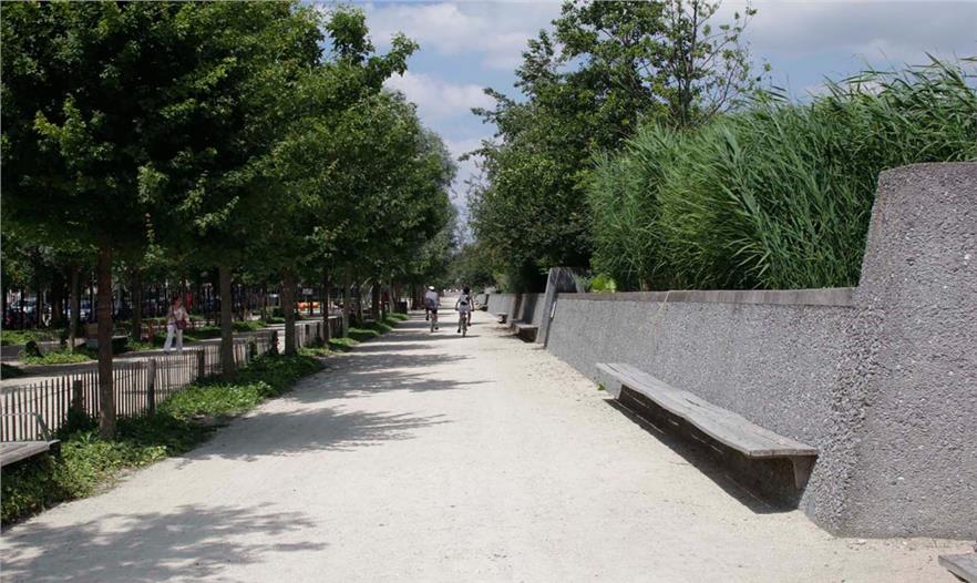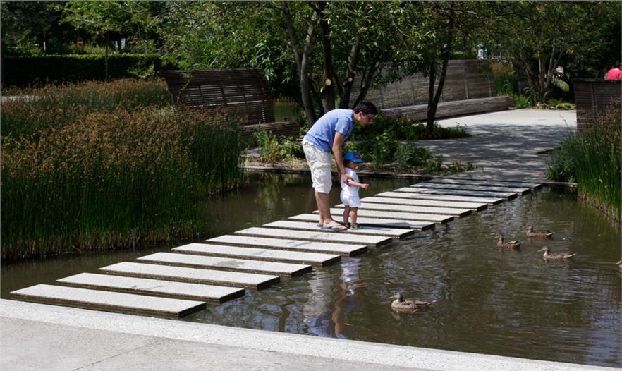 公園坐落于塞納河畔,它最突出的特色是對(duì)河水在設(shè)計(jì)的利用。取水主要利用阿基米德原理,通過(guò)重力作用達(dá)到水系循環(huán)的效果。水的利用形式非常豐富,除了各式各樣的水池、噴泉以及小溪,還用于灌溉,水系通過(guò)一系列凈水花園得到過(guò)濾凈化。將河水引入公園可能是提升公園氛圍多樣性和體驗(yàn)豐富性的最重要的一個(gè)方式。許多材料都是可循環(huán)利用的,比如用來(lái)銜接的黏土、噴泉的混凝土板。