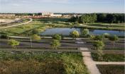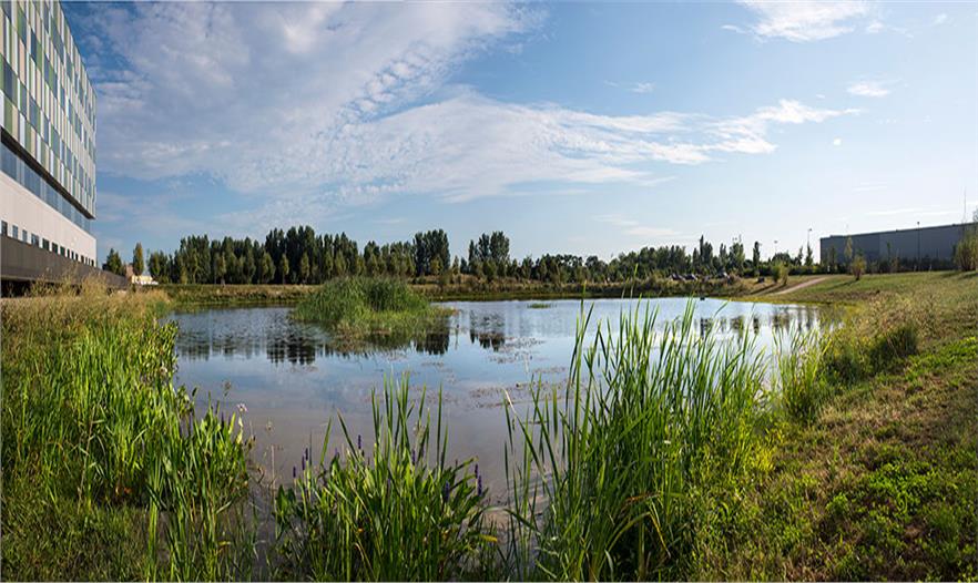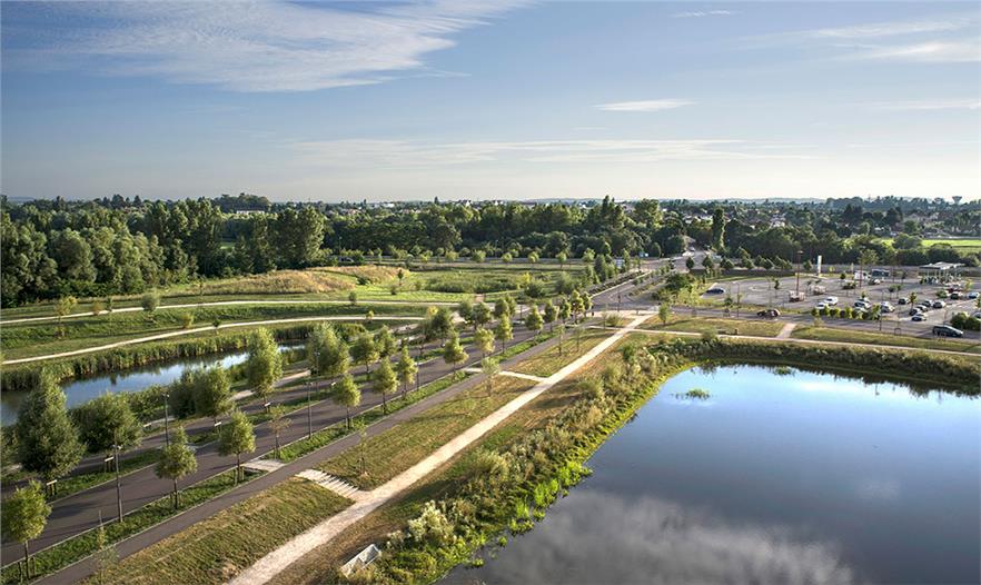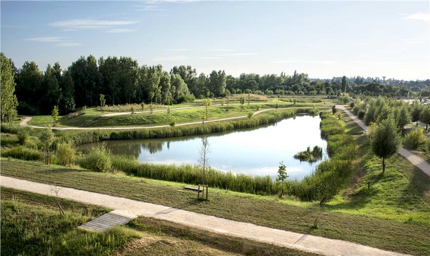 Thalie公園能適應(yīng)河水水位的抬升:當(dāng)Châlonnaise組合環(huán)道加入時(shí),公園建造之前的濕地就被擴(kuò)大填充環(huán)道建造之后的空地。雨水道也可用來儲(chǔ)存雨水。街道兩邊各有一個(gè)水池,看起來醫(yī)院立面和公園南部濕地區(qū)域之間產(chǎn)生了聯(lián)系。這些水池的河岸都種有水生植物,尤其是選擇與釣魚協(xié)會(huì)和國家部門協(xié)商之后的種類。北部水池也會(huì)收集醫(yī)院屋頂上的雨水。