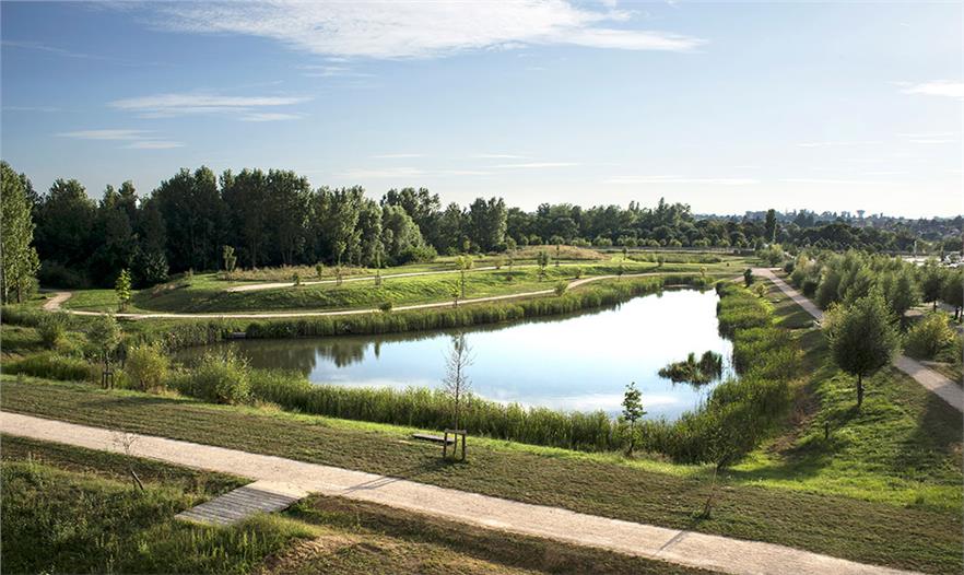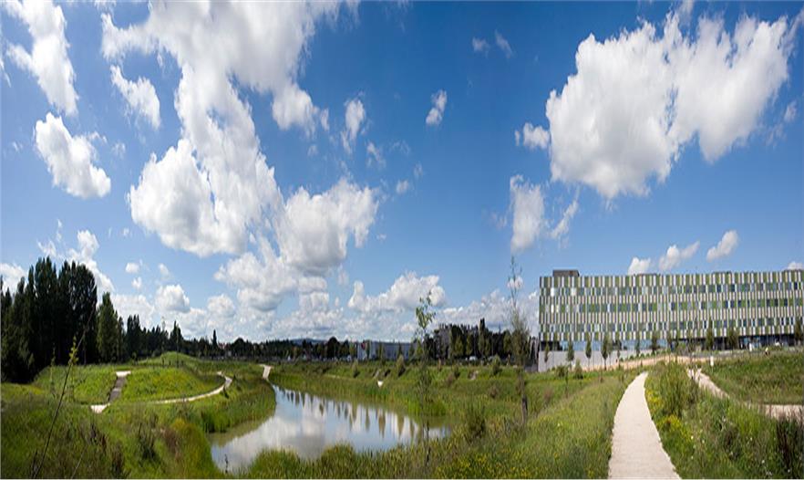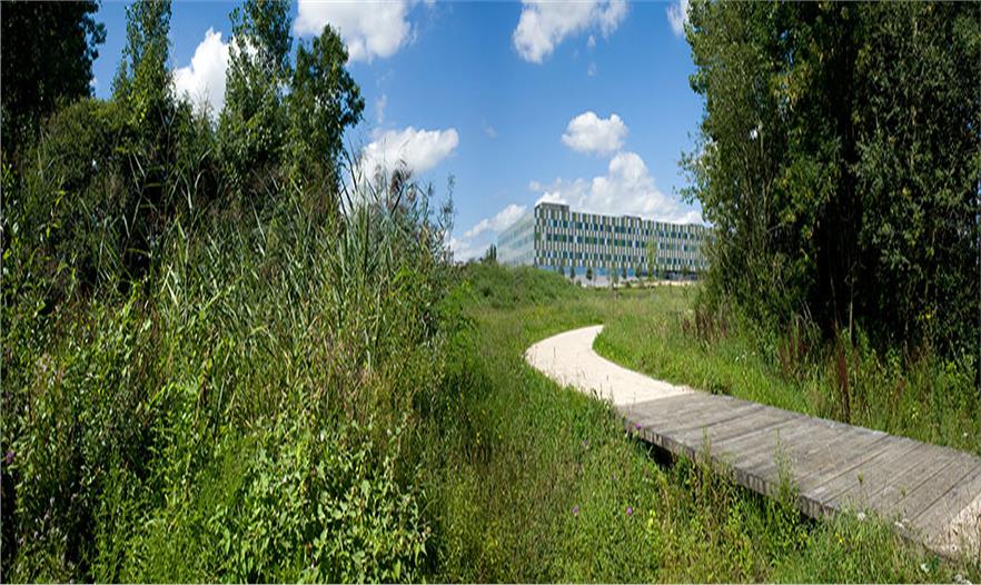 Thalie公園位于Thalie谷自然區(qū)域之間、被遺忘的鐵路基礎(chǔ)設(shè)施邊緣區(qū)之前的一個(gè)填埋場上以及洪澇區(qū)上,其挑戰(zhàn)是管理該區(qū)域的過渡階段,同時(shí)將污染和洪澇限制考慮在內(nèi)。Thalie公園提供了便利設(shè)施(一個(gè)新醫(yī)院和一個(gè)醫(yī)藥中心)和Châlons-sur-Saône小鎮(zhèn)入口處公共空間之間的聯(lián)系。它為醫(yī)院建筑設(shè)計(jì)了一個(gè)綠色空間,通過Thalie和新空間之間的生態(tài)社區(qū)提升生物多樣性。