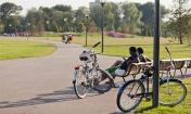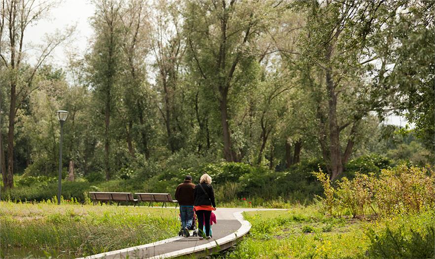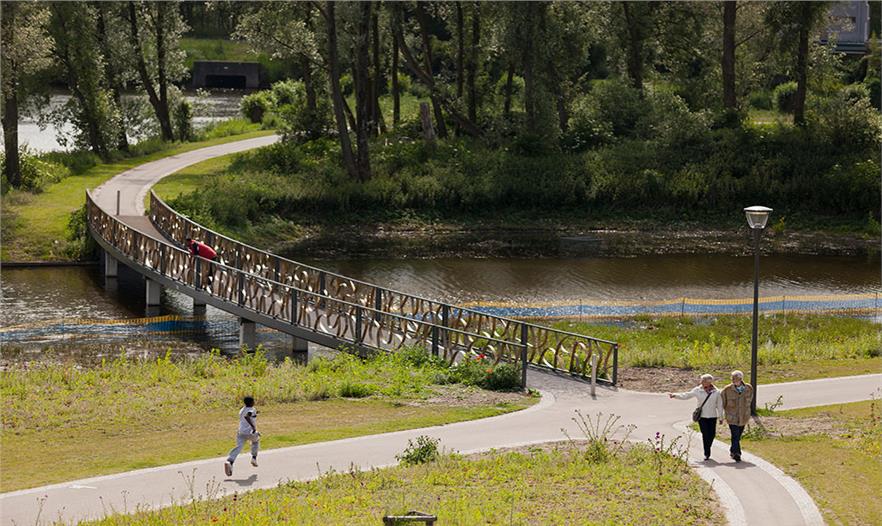 公園整體被抬升了60厘米以減少濕度。公園周圍是條帶狀分布的住宅區(qū)。樹林形成一個天然的隔離帶,隔開了園區(qū)和住宅區(qū)。公園有七個主要入口和三個垂直門,大門隨時保持開放。園內(nèi)的小路宛若一道道美麗的彩虹,將富有文化色彩的北部園區(qū)和自然景觀優(yōu)美的南部生態(tài)園區(qū)連接起來。園內(nèi)的樹木種類繁多、分布各異,在這里可以嗅到到一年四季的不同氣味,感受不同季節(jié)的妙處。