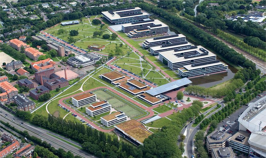 一區(qū)內(nèi)有一系列的辦公大樓運(yùn)行,以垂直于主要的道路的方式排列。設(shè)計(jì)者還在建筑的周?chē)徑麷romme Rijn河的一側(cè)引入護(hù)城河的設(shè)計(jì)理念,象征城市的防御形式。不同的建筑中間一共分布了七個(gè)花園以及一個(gè)閱兵場(chǎng),它們都有自己各自的特點(diǎn)和布局。 二區(qū)則旨在創(chuàng)建一個(gè)與相鄰的大學(xué)相呼應(yīng)的空間結(jié)構(gòu),因此借鑒了相鄰大學(xué)的規(guī)模和結(jié)構(gòu)特點(diǎn)。該場(chǎng)地主要由石板道路、大草坪和大樹(shù)組成景觀(guān)框架。三區(qū)的中央公園則起到城市的綠色核心的作用,幫助維持復(fù)雜的生態(tài)平衡。