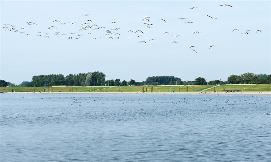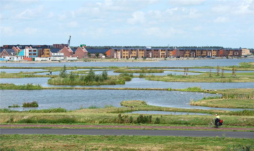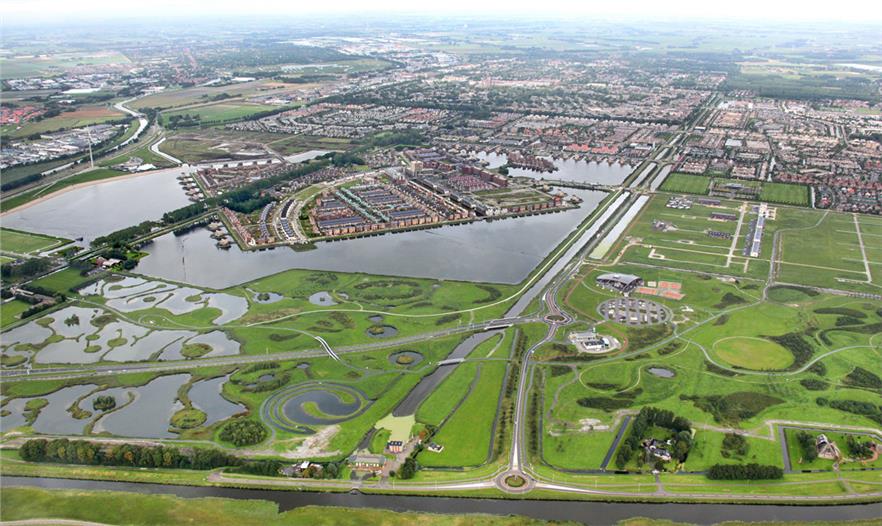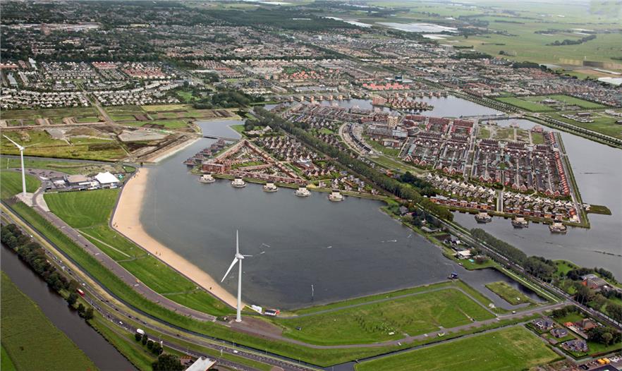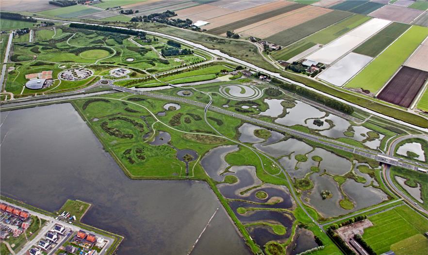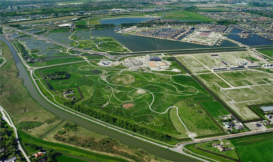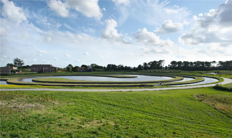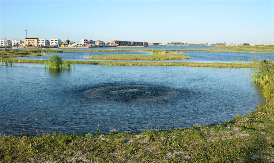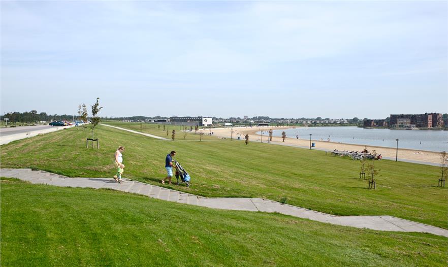 Stad van de Zon發(fā)展區(qū)完全被開(kāi)放的水圈環(huán)繞,包括70多公頃的新水。這個(gè)水圈將住宅區(qū)與周?chē)男蓍e區(qū)域分離開(kāi),確保規(guī)劃區(qū)有大量的開(kāi)放空間。該休閑區(qū)有兩側(cè):內(nèi)側(cè)朝向開(kāi)放水源和Stad van de Zon發(fā)展區(qū),外側(cè)朝向周邊的景觀。其水系統(tǒng)是獨(dú)特的:在夏季用來(lái)儲(chǔ)存大量的水、保護(hù)水源。設(shè)計(jì)師的主要精力放在了水質(zhì)、可達(dá)性和體驗(yàn)系統(tǒng)的能力上,為此就要設(shè)計(jì)大量的結(jié)構(gòu),包括循環(huán)泵站、自然過(guò)濾廠、脫磷水池、橋梁和劃艇通道。