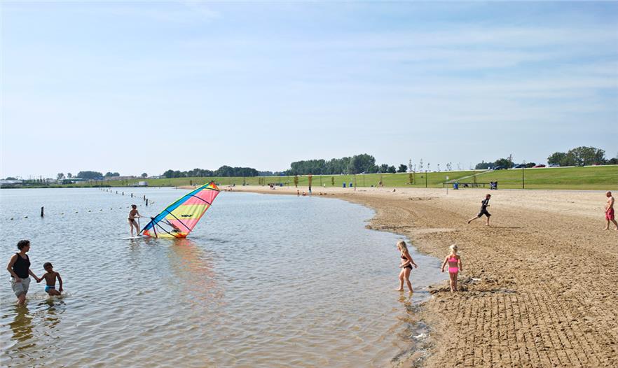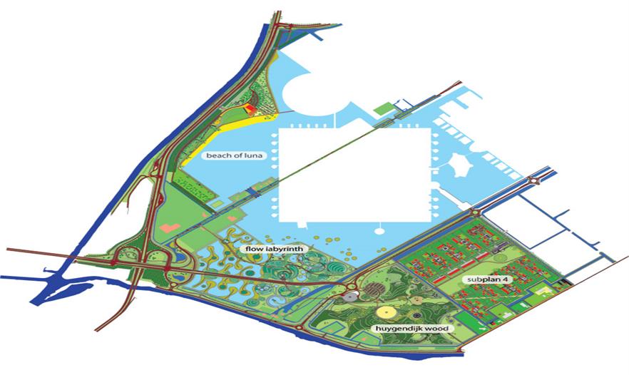休閑區(qū)是由幾個(gè)分區(qū)構(gòu)成,每個(gè)都有各自的特征:Druiplanden、Huygendijk 林地和Subplan 4。Druiplanden提供一個(gè)平臺(tái),建造設(shè)施和大量的河岸休閑區(qū)(沙灘、日光浴區(qū)、停車(chē)場(chǎng)、滑水休息區(qū))。Subplan 4是Heerhugowaard南市區(qū)和休閑區(qū)之間的過(guò)渡地帶。Subplan提供戶(hù)外生活空間,周?chē)G樹(shù)環(huán)繞。寬闊的休閑路線橫穿該區(qū)域,將休閑區(qū)與Heerhugowaard南的城市區(qū)域結(jié)合起來(lái)。Huygendijk林地陰涼區(qū)多,提供了散步、騎自行車(chē)、慢跑和滑旱冰的空間。其裝飾元素包括森林區(qū)、開(kāi)放草地和自然河岸。許多挖掘水的土壤都被運(yùn)到Huygendijk林地。這些土壤也得到了利用,與DRFTWD事務(wù)所的藝術(shù)家合作建造出各種各樣的區(qū)域,讓人們體驗(yàn)各種經(jīng)歷。